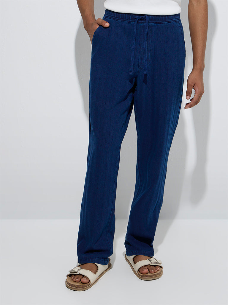 ETA offers these indigo chinos in a minimalist profile. Tailored from pure cotton in a relaxed fit, they feature an elasticated waistband, adjustable drawstrings, and multiple pockets for added utility.