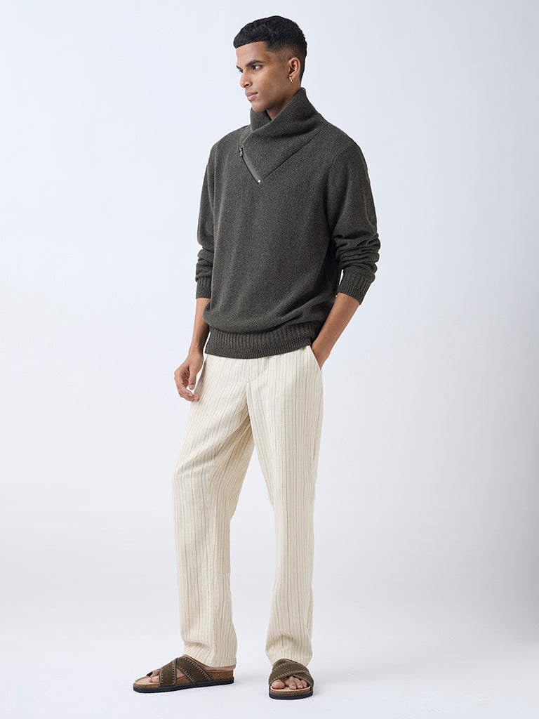 This olive ETA sweater brings textural warmth to colder days. Made from a sumptuous fabric blend, the relaxed fit offers steady comfort without feeling heavy. The shawl collar is finished with an asymmetric zip that adds visual interest, while ribbed trims shape the edges for a neat, grounded finish.