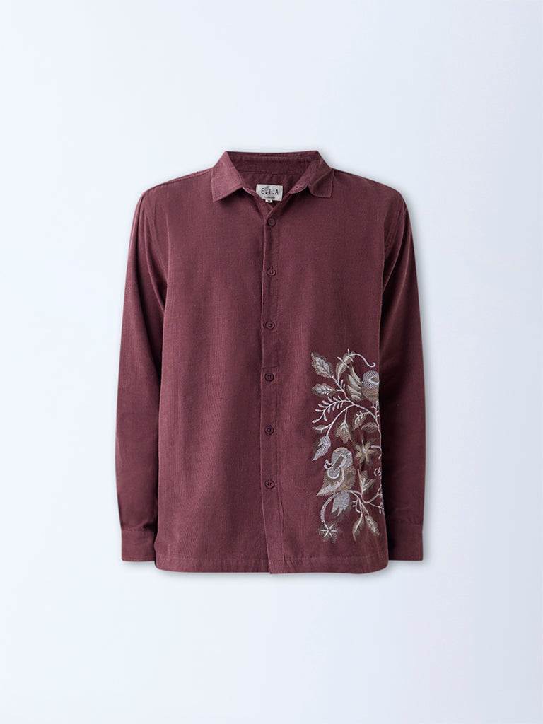 Deliver an eye-catching statement with this wine corduroy shirt from ETA exhibiting striking floral embroidery across the front. Structured in a relaxed frame, it is fitted with a semi-spread collar, a button-up front and full sleeves for a refined look. Woven from pure cotton fabric, it offers a soft and breathable feel that ensures all-day comfort.