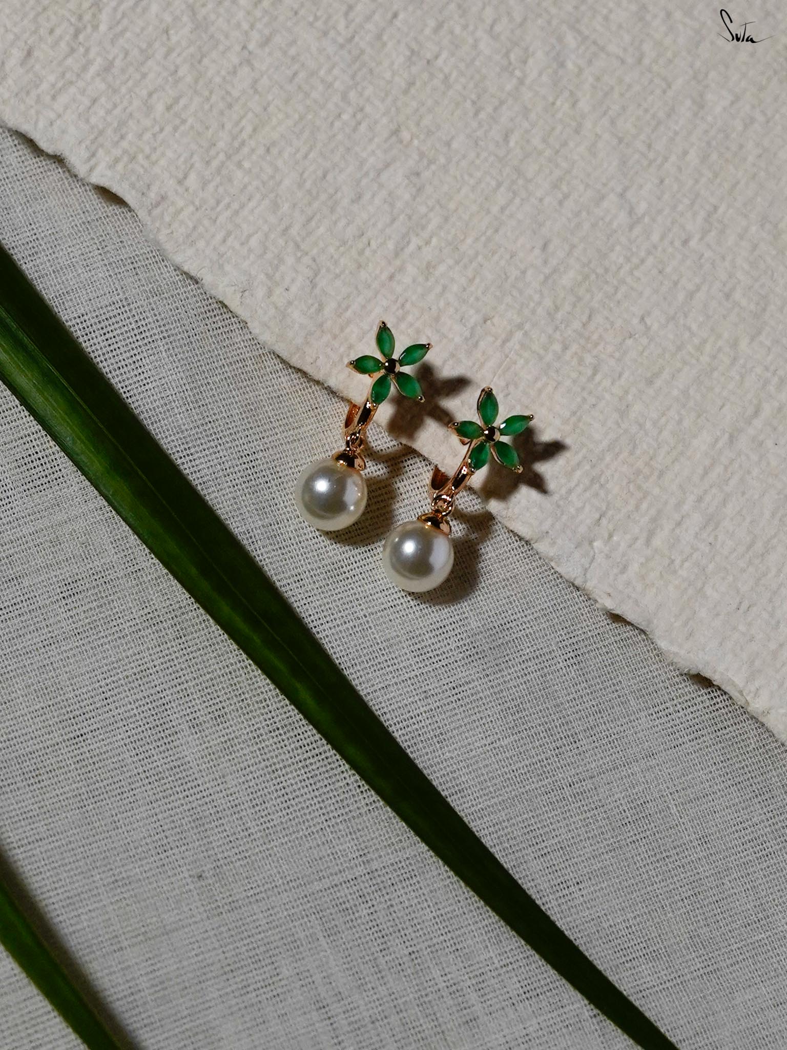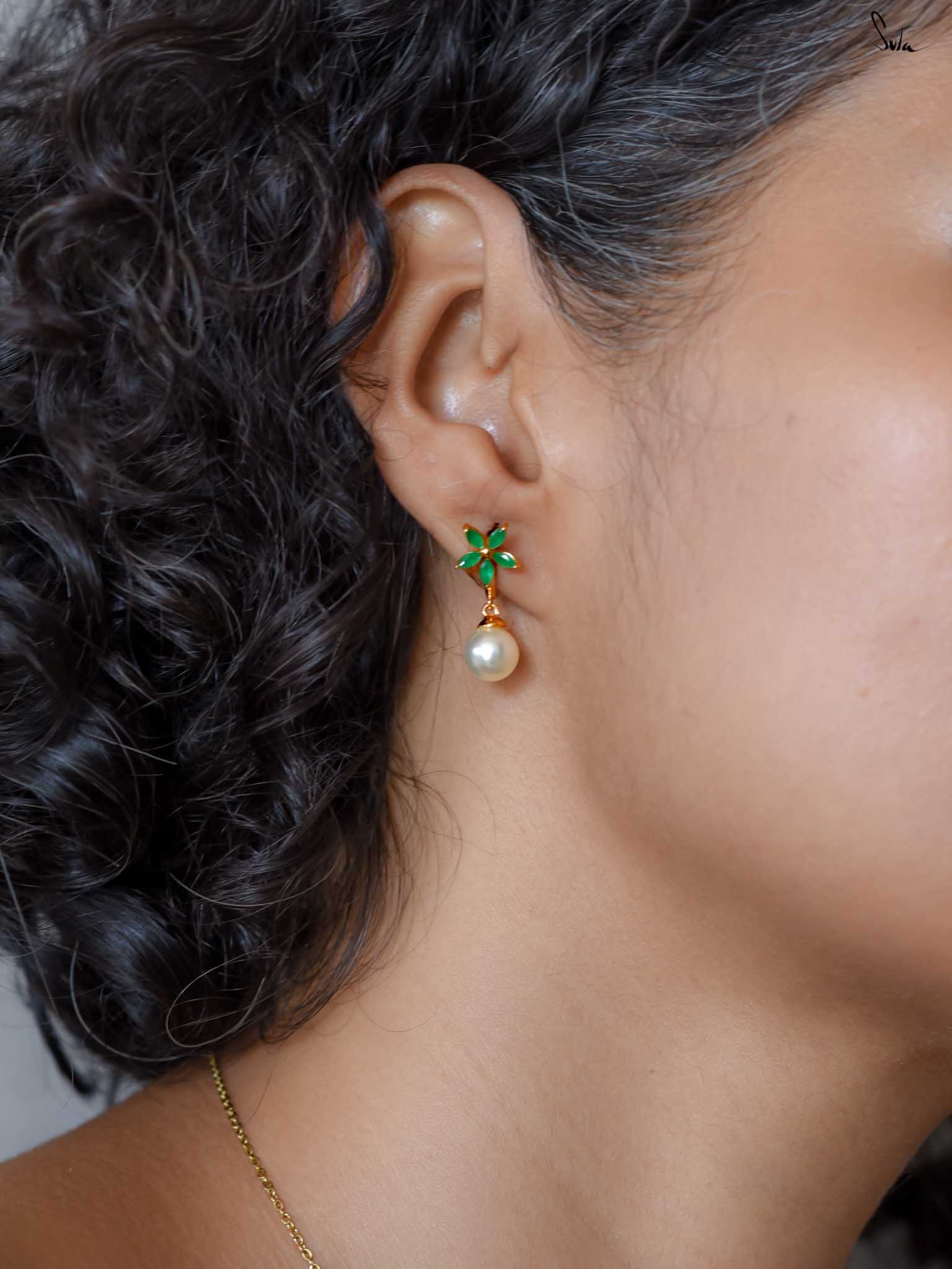 Screw earrings in silver-brass alloy with pearl and emerald. A bloom mid-whisper, petals wrapped around hope.