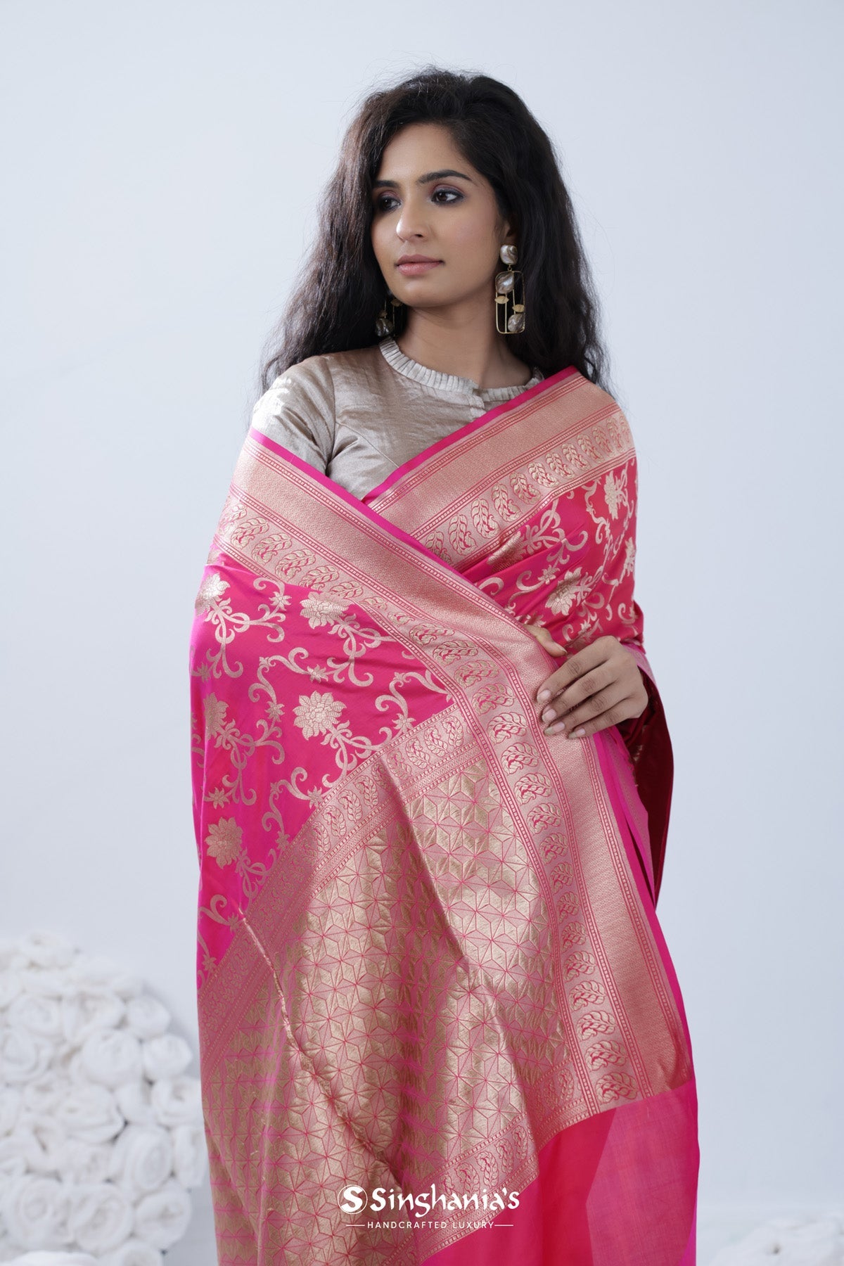 Festive french pink banarasi silk saree with floral jaal design and small border with floral creeper design in gleaming gold zari weaving. The handwoven saree is a perfect choice for wedding parties and festive wear.
