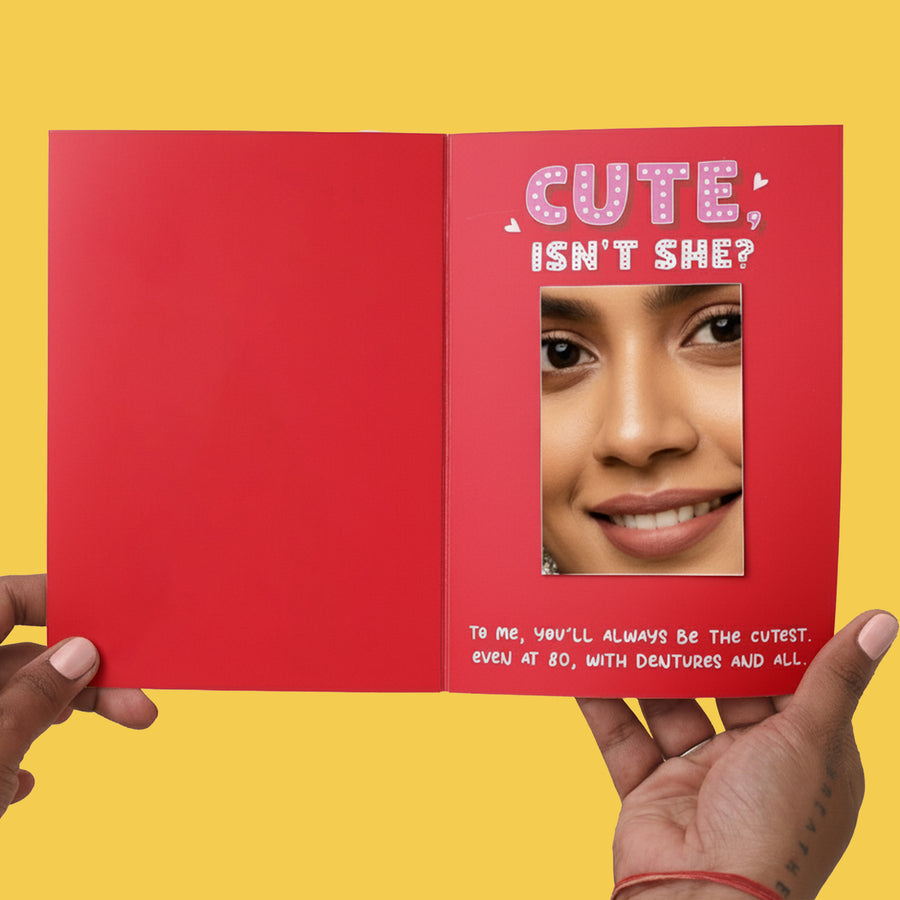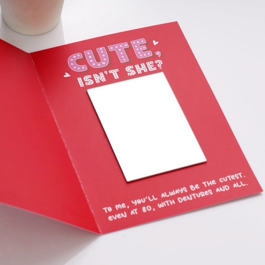 Inside: When she opens it, she’ll find her own reflection thanks to the attached mirror, along with the sweet, playful text: "CUTE, ISN'T SHE?" This is followed by a loving commitment that is both sincere and humorously realistic: "To me, you'll always be the cutest. Even at 80, with dentures and all."