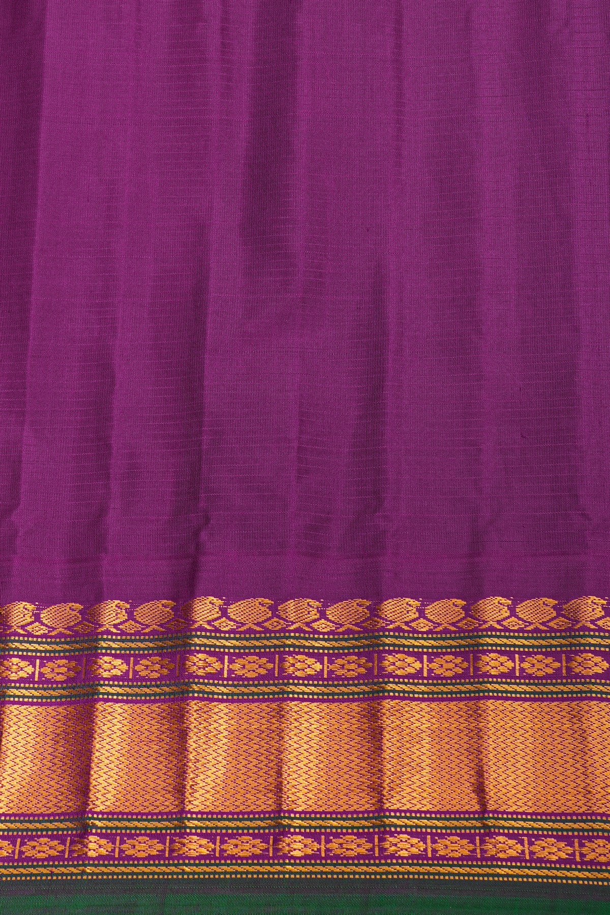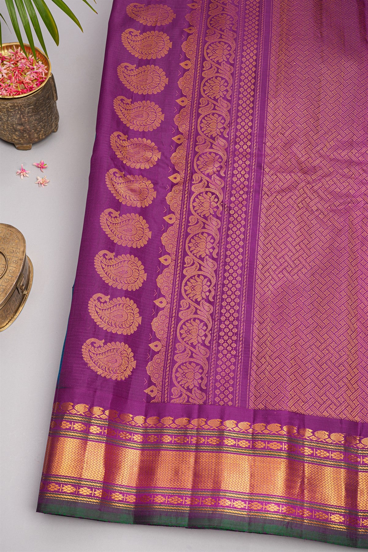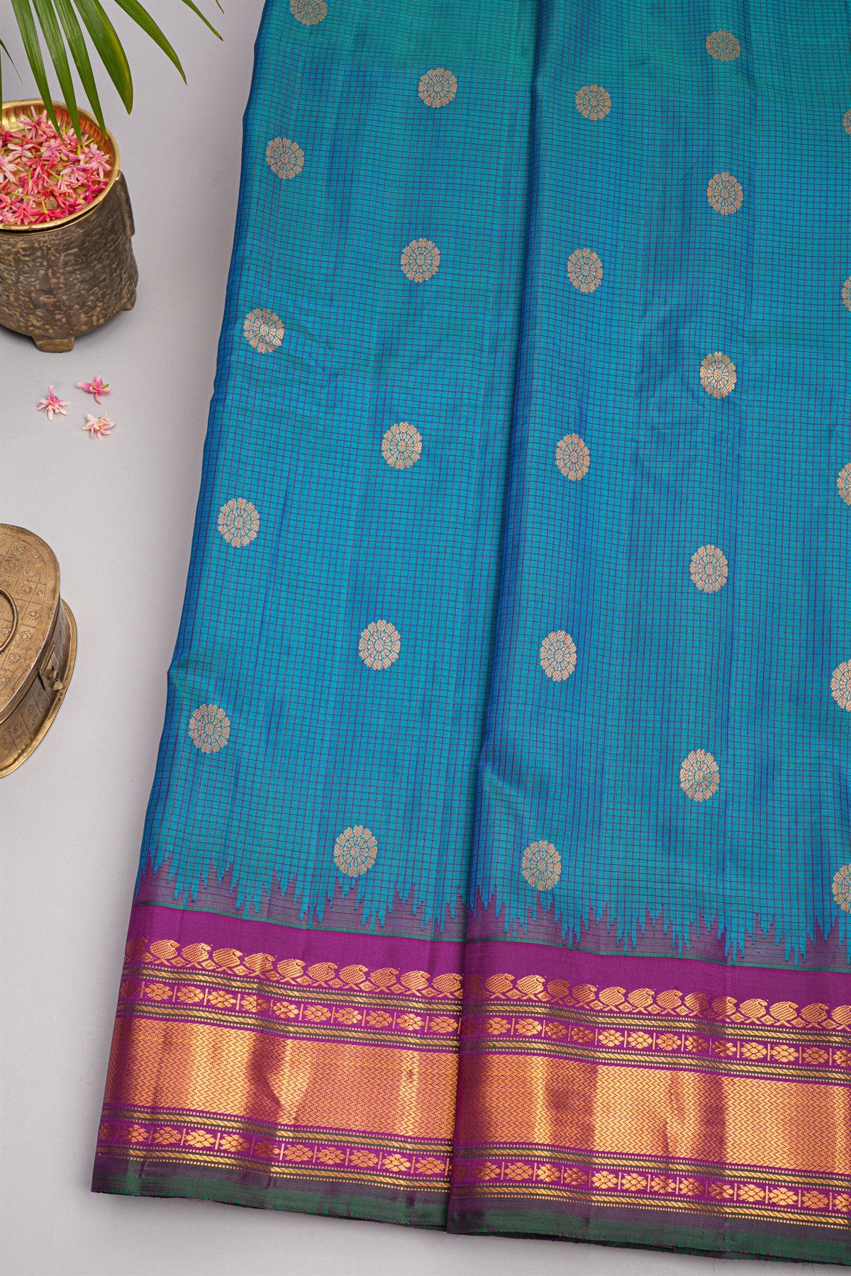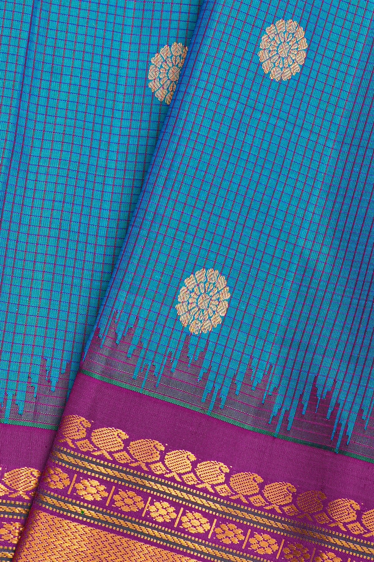 Embrace tradition with every drape of our Gadwal Silk Sky Blue Saree. The checks and floral buttis elevate the luxury of the saree. The contrast border featuring zig-zag lines and florals exudes timeless elegance. Akin to the notes of mesmerizing orchestra, the ensemble together with the brocade pallu and the contrast with border blouse imparts soothing charm, making it a unique festive choice.