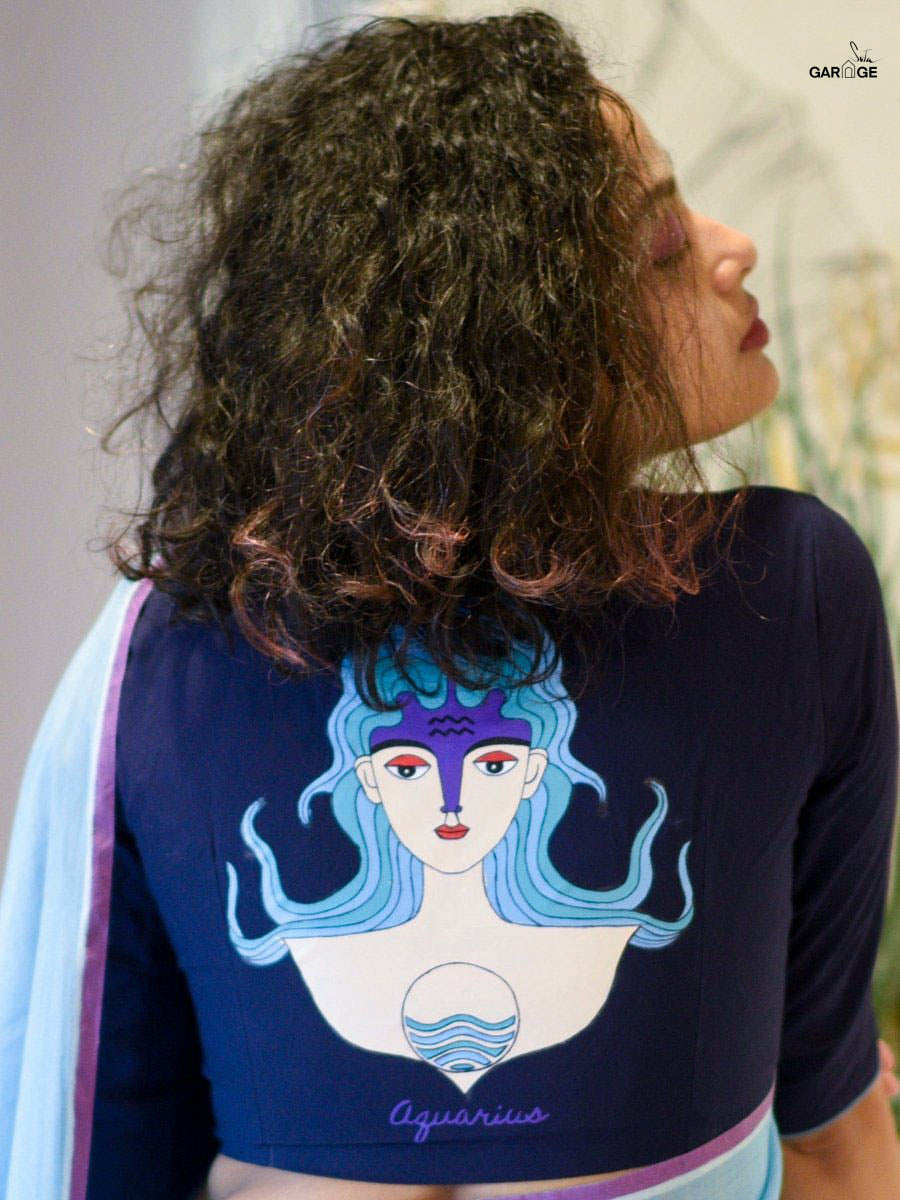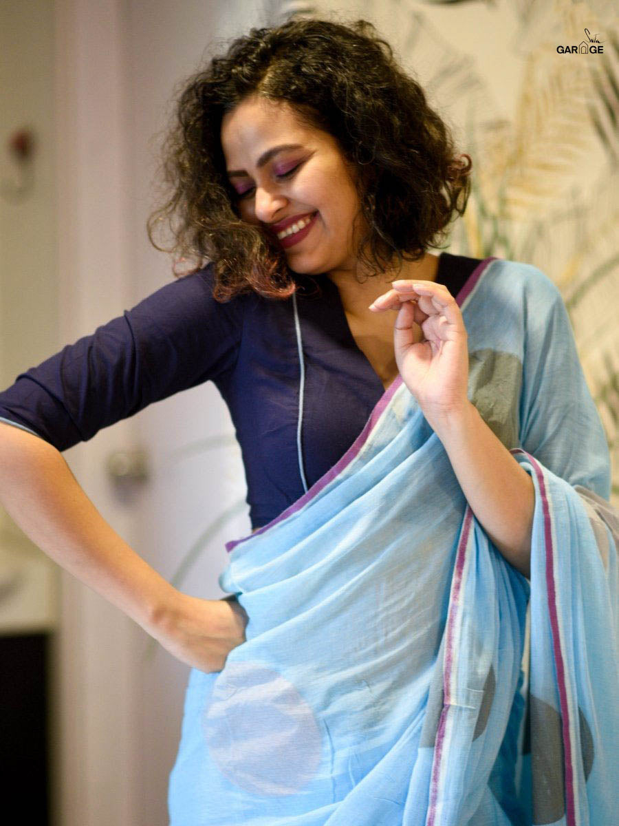 Su, the model is wearing size S blouse and the saree is Floating Stars in the Galaxy Polka.