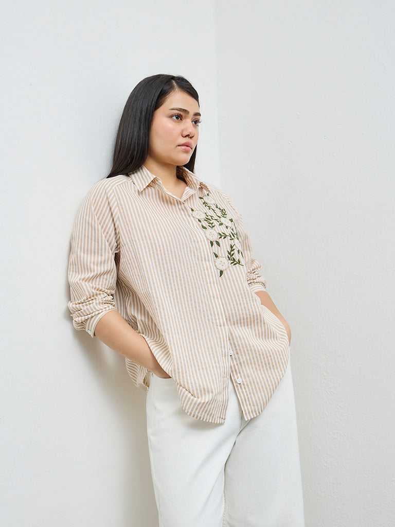 This beige stripe-printed shirt from Gia highlights floral embroidery for added charm. It is milled from cotton-rich fabric, offering a soft feel and a superior comfort. Designed with a notched collar, a button-up front and full sleeves, this relaxed silhouette serves as an effortless pick for your day-to-day rotation.