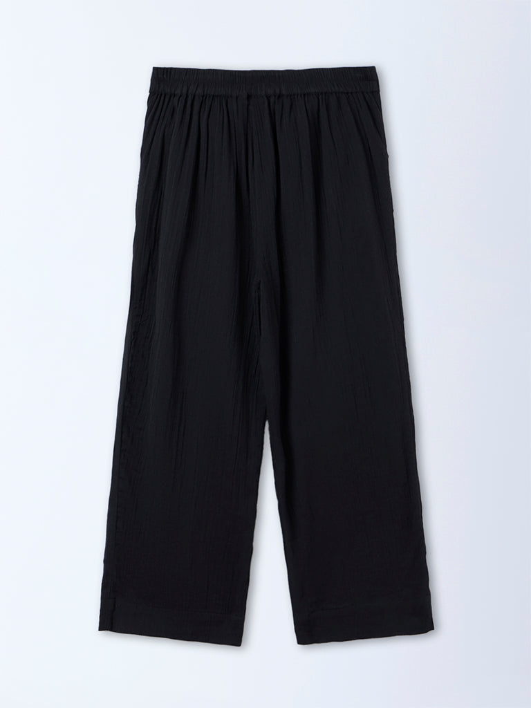 Built for everyday ease, these black pants from Gia offer a relaxed yet put-together feel. Crafted from breathable cotton, they feature a crinkle-textured finish that adds subtle character. The high-rise silhouette is complemented by an elasticated back for comfort, while side pockets bring functional practicality to the design.