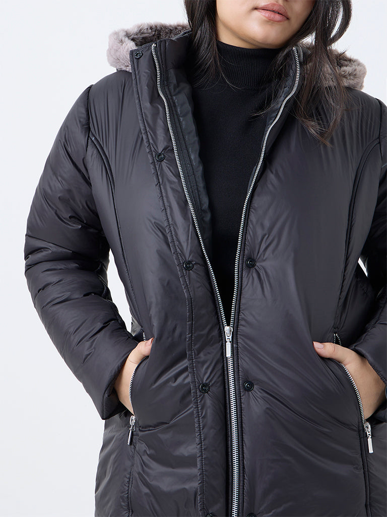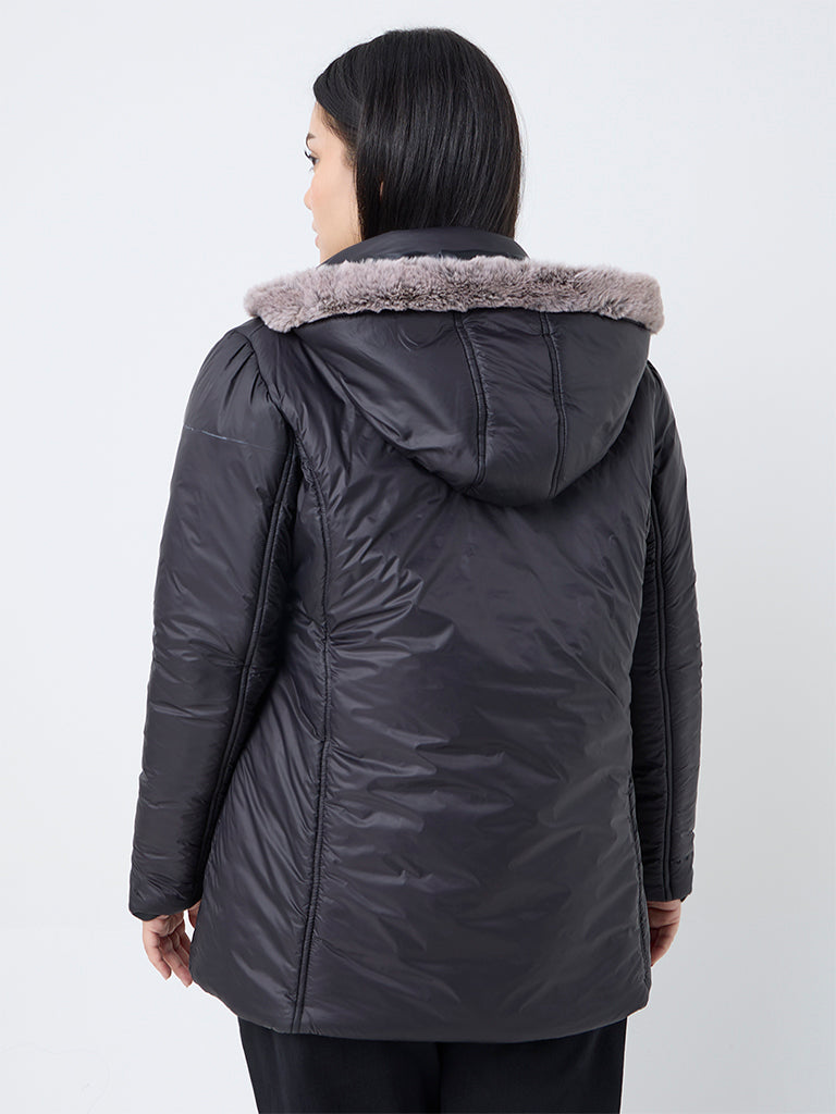 This black puffer jacket from Gia is designed for warmth and sleek everyday wear. The hood is outlined with soft fur that enhances both comfort and style. A full-zip placket sits beneath fastening buttons to create a smooth, insulated finish, while the zipped kangaroo pockets add practical utility. Crafted from premium fabric with a smooth handfeel, it delivers effortless winter layering for daily outings.