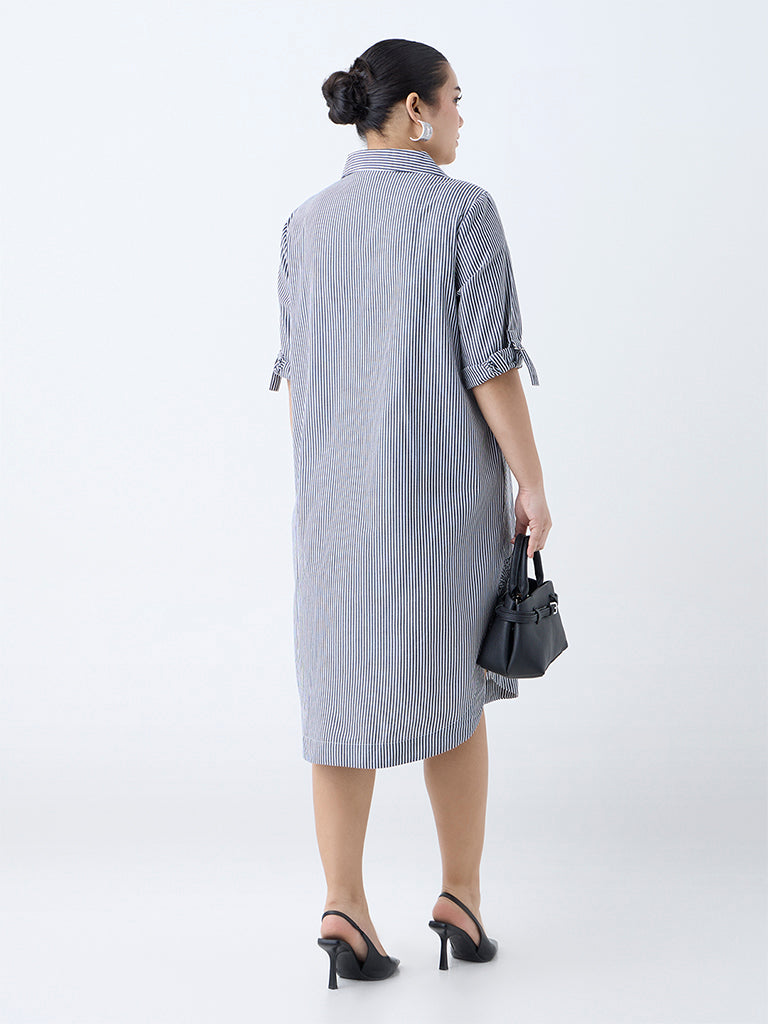 Reworking a classic with feminine charm, this black tunic dress from Gia is detailed with crisp stripes and delicate floral lace near the hem. Constructed from pure cotton for breathable comfort, it features a sharp collar with a concealed button placket, upturned three-quarter sleeves and side pockets that marry polish with practicality.
