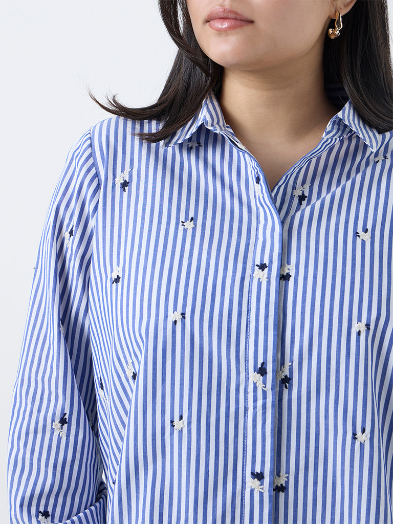This blue shirt by Gia is elevated with delicate floral embroidery layered over a striped base, creating a refined blend of pattern and texture. Made from pure cotton for breathable comfort, it features a crisp collar that extends to a concealed button placket and full sleeves finished with buttoned cuffs.