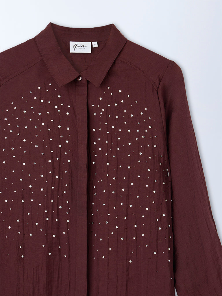 An eye-catching design from Gia, this brown shirt features embellished studs across the front, elevating the minimal silhouette. Framed with a shirt collar, a concealed button placket and full sleeves, it is crafted from soft, lightweight fabric for a breathable and sumptuous feel.