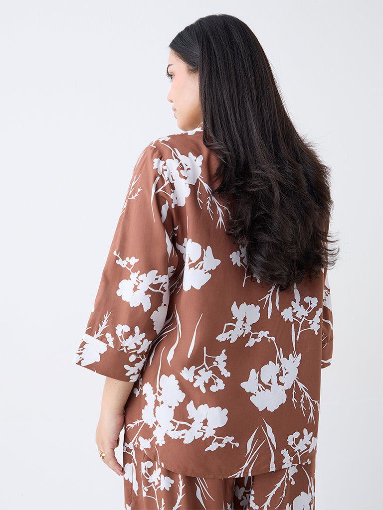 Soft, feminine, and thoughtfully crafted, this brown blouse from Gia features delicate foliage prints that bring gentle character to the silhouette. The sumptuous fabric drapes comfortably, while the V-neckline flows into a concealed button placket for a clean, elongating finish. Three-quarter sleeves complete the look, making it a versatile choice for both work and relaxed outings.