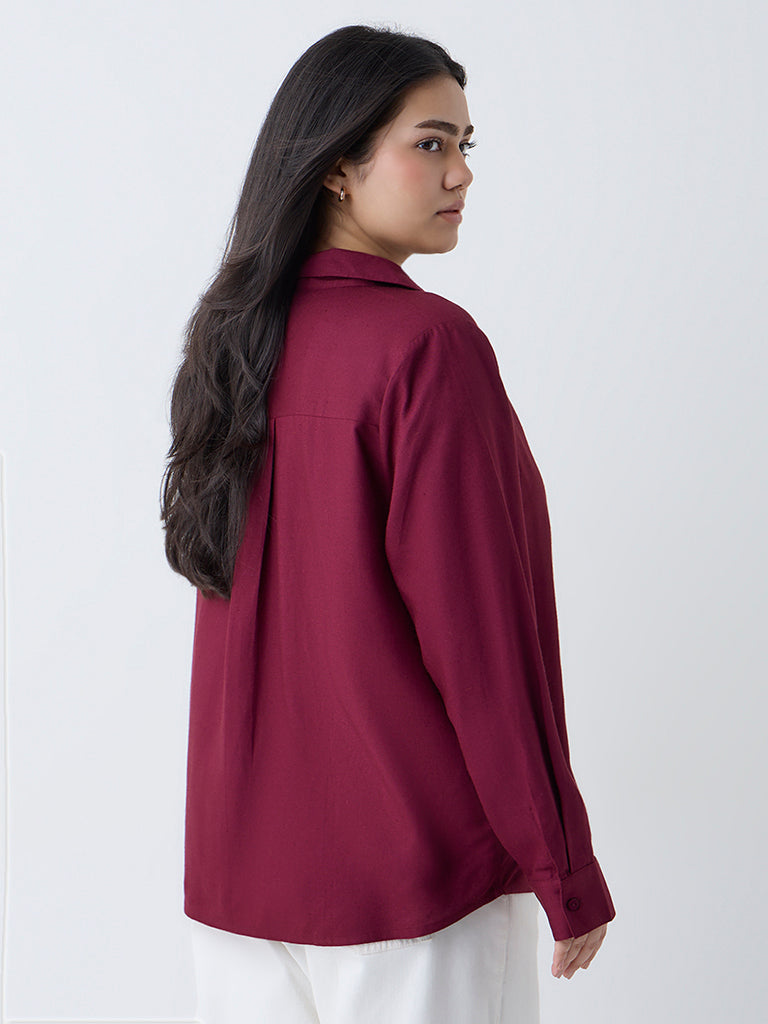 Stay cool and confident in this burgundy blouse from Gia. Crafted from breathable fabric, it feels light against the skin perfect for warm summer days. Pintuck detailing adds texture through the front, while the collar, concealed button placket and full sleeves keep the silhouette clean and structured.