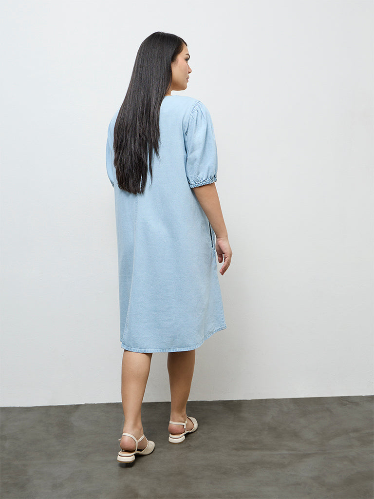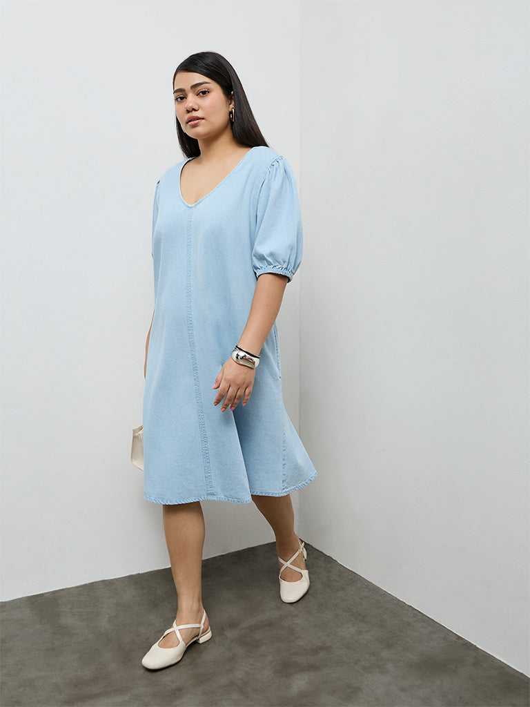 Define your evening wear rotation with this light blue denim dress from Gia. Fashioned in a breezy A-line silhouette, it is styled with a V-neckline and puff sleeves for a charming design. The lightweight fabric promises uninterrupted comfort, making it suitable for casual day-outs and warm weather occasions.