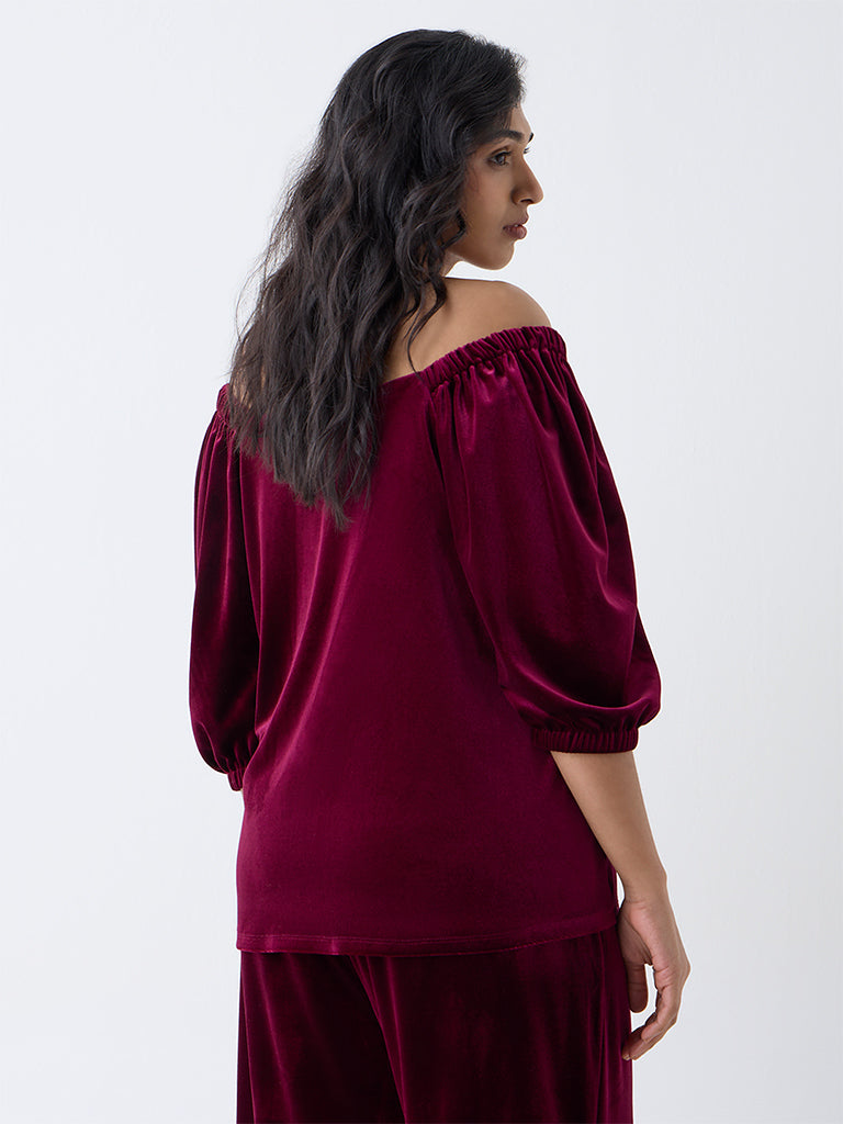 Rich and alluring, this maroon velvet top from Gia features a flattering off-shoulder neckline and blouson sleeves. The plush texture and fluid drape make it an effortless statement for evenings that call for easy glamour.