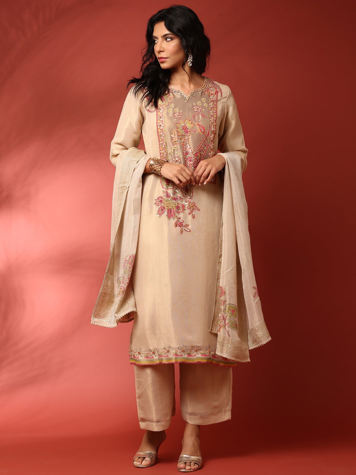 Elevate your style with this Gold Beige Tissue Aplique work 3-piece suit set, designed to combine elegance and comfort effortlessly. The delicate applique detailing enhances its luxurious fabric, offering a sophisticated look perfect for festive occasions or formal events. This set ensures you stand out with timeless charm and a flattering fit.