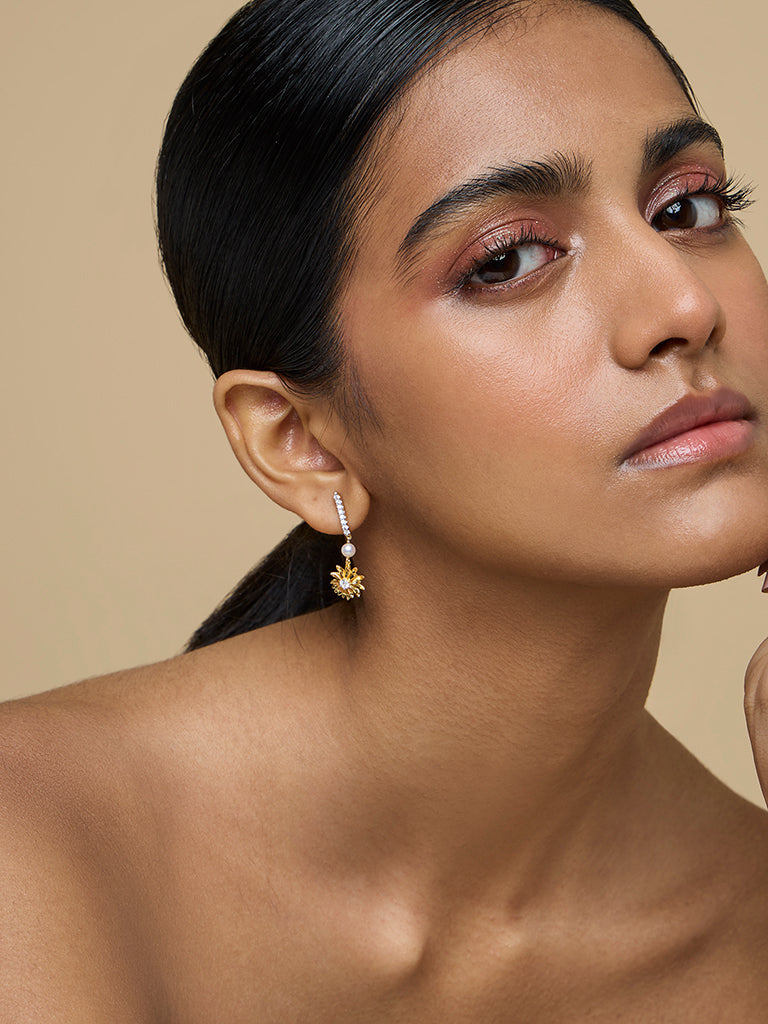 These drop earrings from Westside X Pome are crafted with a gold-tone finish, each earring showcases a dainty daisy with a sparkling clear stone at its center, followed by a pearl drop. A slender, curved gold-tone accent adorned with small clear stones extends from the daisy, adding a refined touch. Secured with a post-back closure, these earrings offer both elegance and comfort, making them a perfect choice for elevating any outfit.