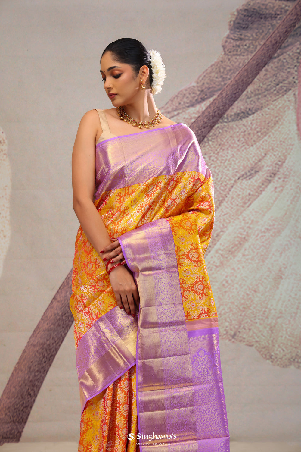 A striking gold orange kanjivaram silk saree featuring floral ogival pattern in gold and tilfi zari weaving. The contrasting big border showcases floral and kaddi pattern, while the pallu has continuing floral pattern all over. An heirloom piece perfect for special occasions.