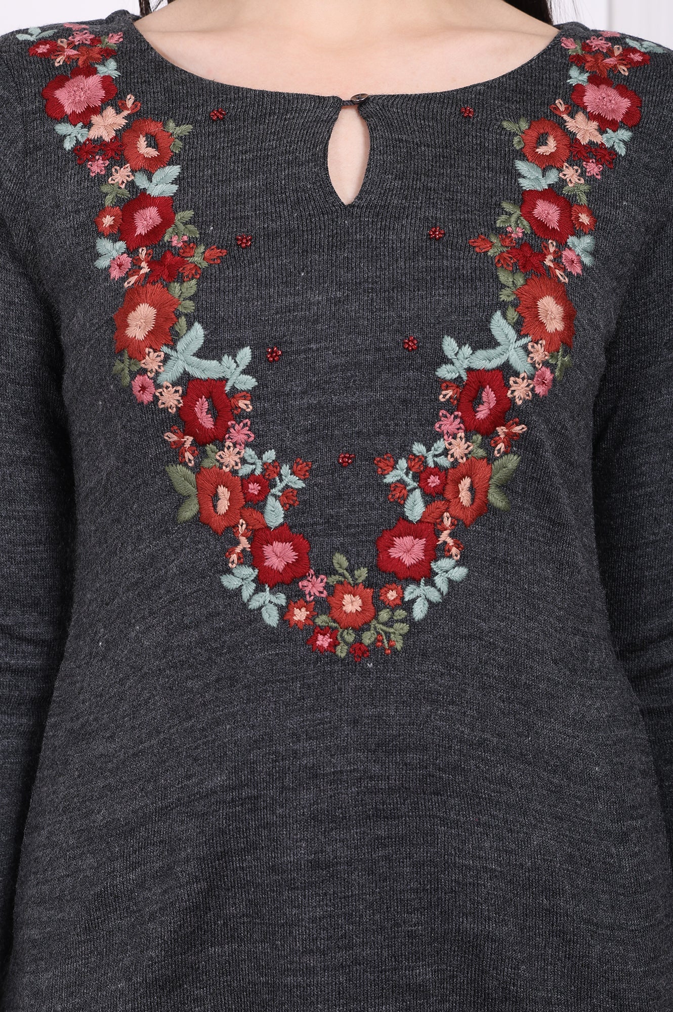 A whisper of winter elegance defines this beautiful kurta for women, presented in a rich Charcoal Heather shade. This apparel is thoughtfully designed to offer both exceptional warmth and sophisticated style, making it an essential addition to your cold-weather wardrobe. The absolute highlight is the stunning and intricate floral ornamentation that gracefully adorns the yoke, creating a beautiful frame around the chic keyhole neckline. Its flattering A-line silhouette flows effortlessly from the shoulders, creating a graceful shape that complements various body types. The full-length sleeves provide ample coverage and warmth, ensuring you stay cozy through the day's engagements. Crafted from a wonderfully soft and entirely opaque fabric, this ethnic tunic moves with you, promising complete comfort without any hint of transparency. The hemline is clean and subtly flared, enhancing the garment’s graceful drape and movement. This single-piece apparel is perfect for those seeking an impeccable blend of traditional craftsmanship and contemporary design. You'll find yourself reaching for this versatile embroidered A-line kurti for everything from casual brunches and workdays to quiet festive evenings. It's a timeless statement of refined taste, promising to be a cherished piece for seasons to come.