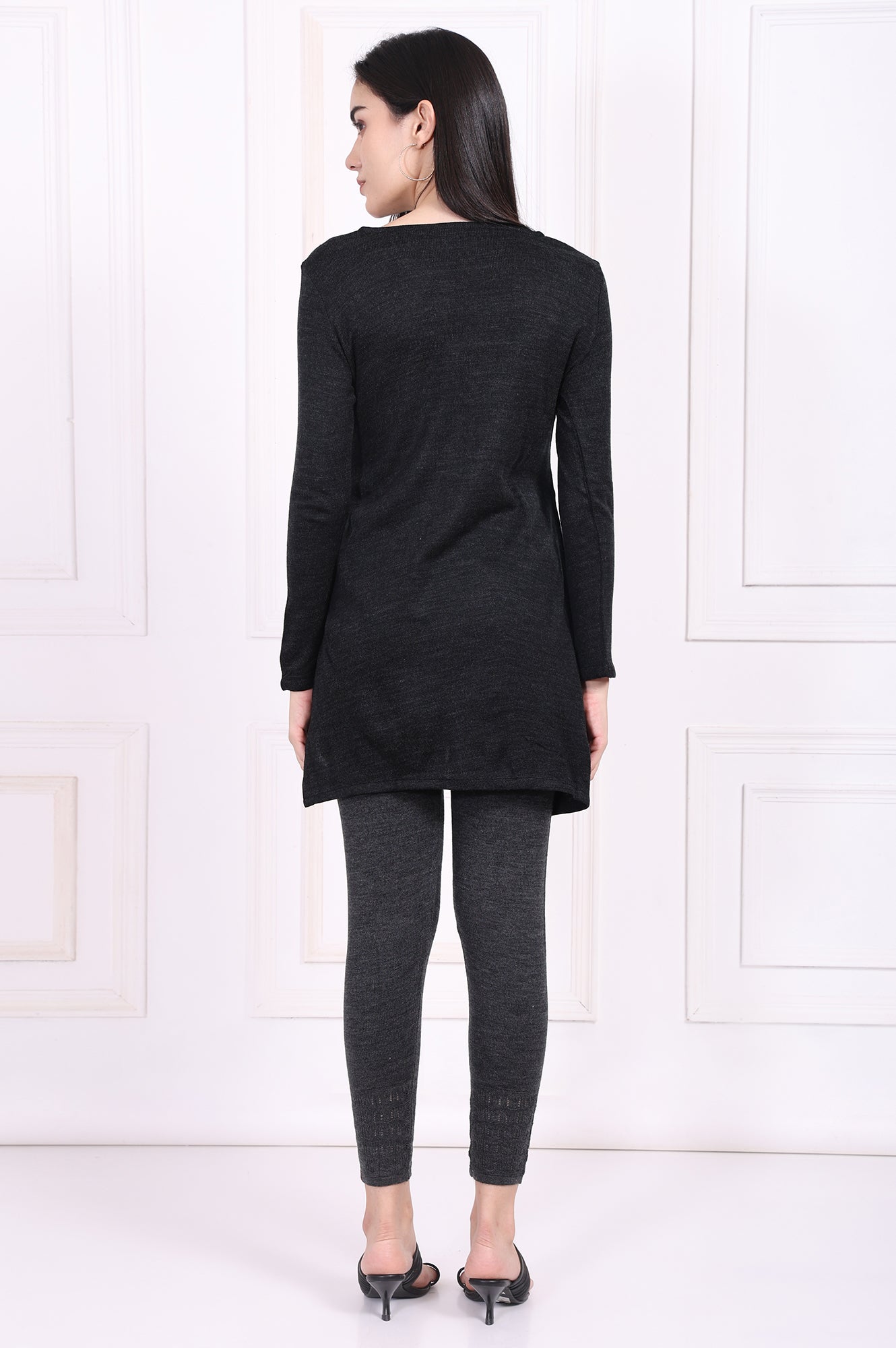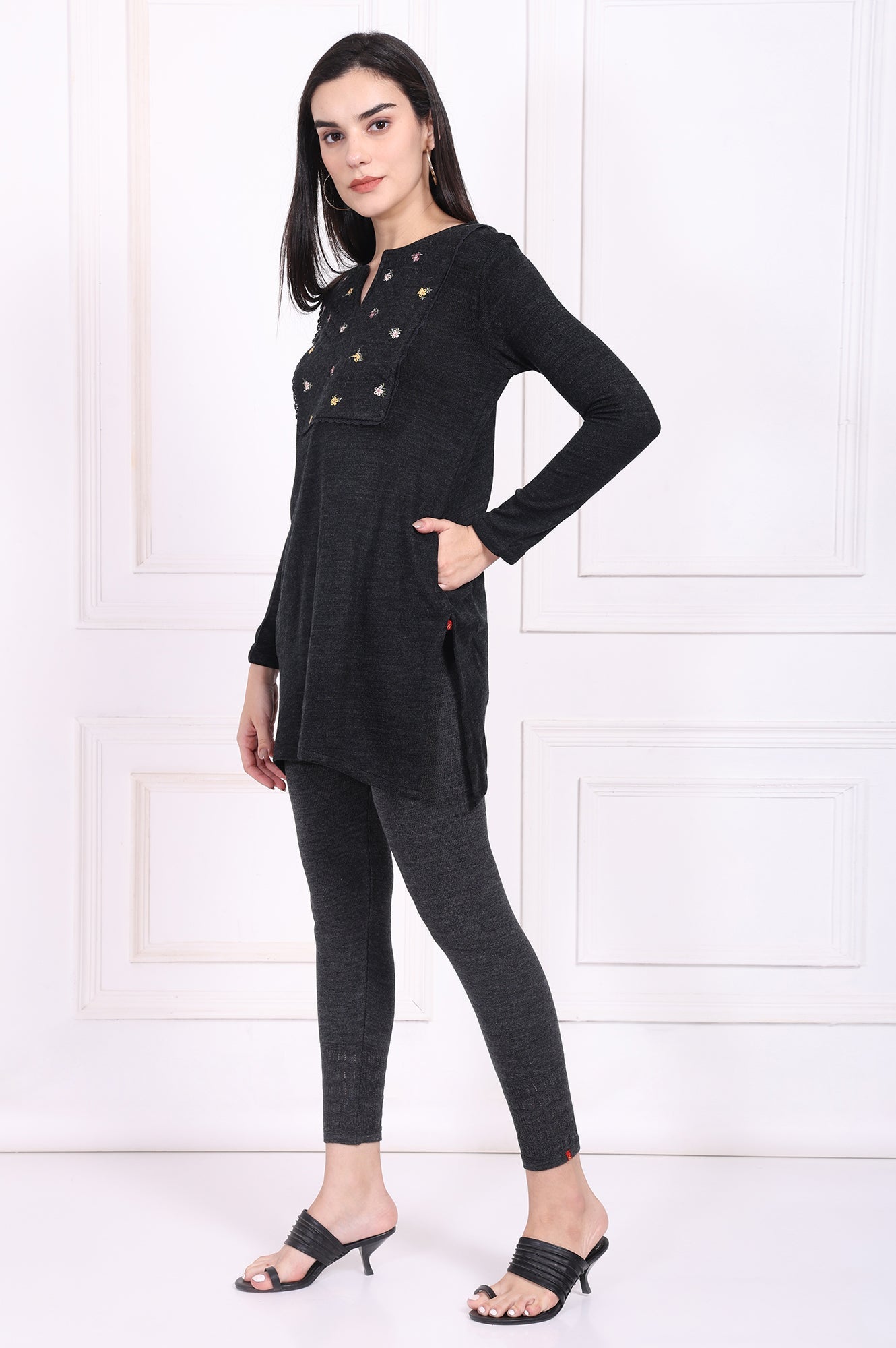 Cozy sophistication defined, this charming tunic is a testament to understated winter style. It’s the perfect kurti for women seeking both warmth and elegance, designed to glide effortlessly from a casual day out to a relaxed evening gathering. The silhouette is a classic straight cut, crafted in a deep charcoal grey hue that offers endless pairing possibilities and flatters every form. Your eyes are drawn to the tastefully designed yoke, which showcases delicate multi-colored floral embroidery, a garden of subtle color against the rich backdrop, all framed by a chic scalloped trim. It features a flattering notched V-neckline that adds a touch of modern grace, complemented by full-length sleeves for complete comfort. The fabric feels wonderfully soft and warm against the skin, ensuring you stay snug without an ounce of sacrificed style. This completely opaque winter tunic falls to a straight hemline finished with functional side slits, enhancing movement and adding to its relaxed feel. We’ve even included discreet side pockets for your essentials. You'll find this beautiful grey embroidered kurti becomes an indispensable part of your cold-weather collection, effortlessly blending traditional motifs with contemporary comfort in one stunning piece of apparel.
