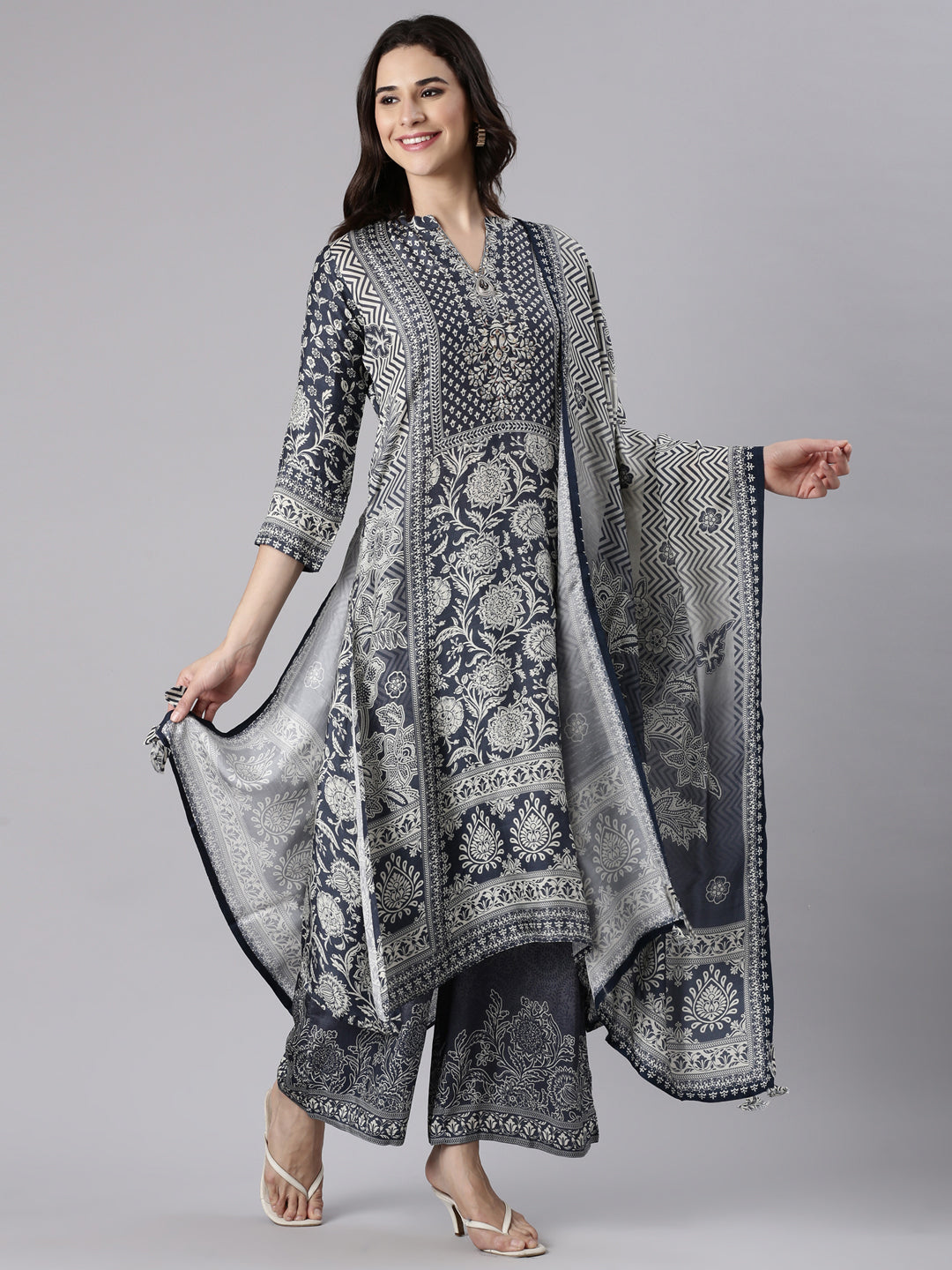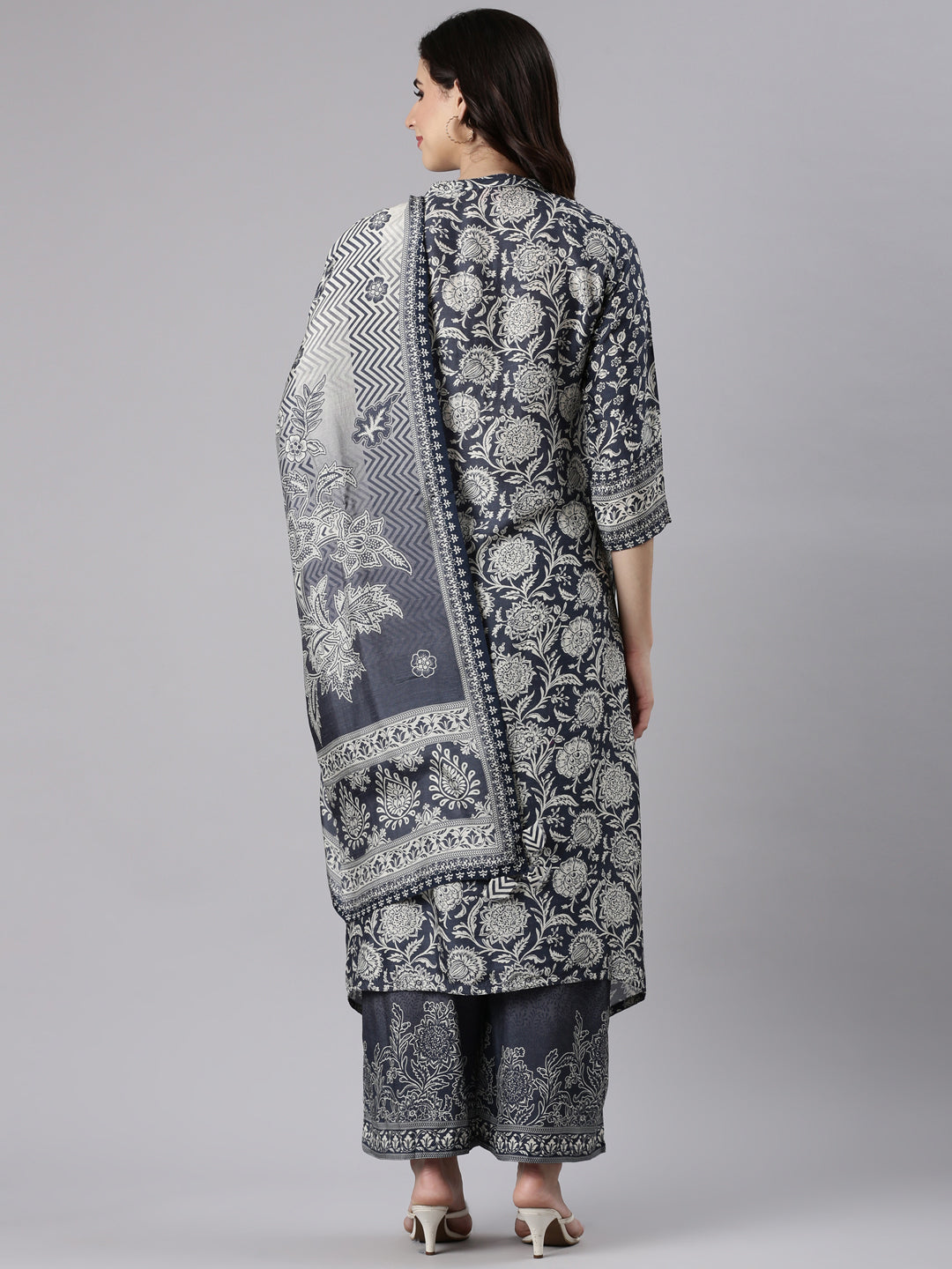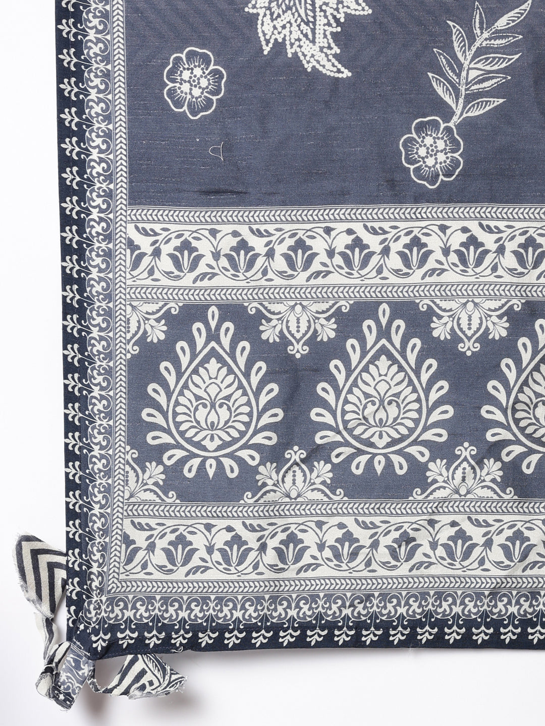 Elevate your wardrobe with this Grey Muslin Printed A-Line Three Piece Set, featuring a gracefully flared silhouette that ensures comfort and style. Crafted from breathable muslin fabric, its subtle prints add a refined touch, making it perfect for both casual and semi-formal occasions. This versatile set combines elegance and ease, offering a polished look with minimal effort.