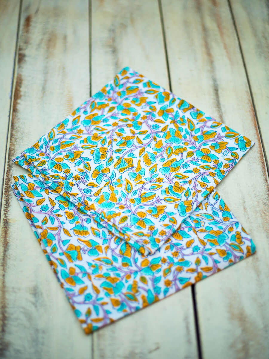 A set of six hand block print table napkins in our signature design. Make a set with our matching selection of table cloth, table mats, table runner, tea cozy, and more.