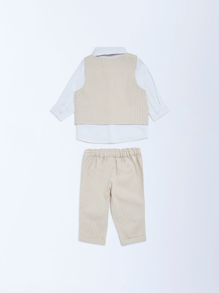 Dress your little one in timeless charm with this beige formal set by HOP Baby. The ensemble includes a crisp white shirt, a striped waistcoat with matching bow tie, and coordinating trousers for a polished finish. Woven from pure cotton fabric for all-day comfort, it’s perfect for celebrations, family gatherings, and picture-perfect moments.