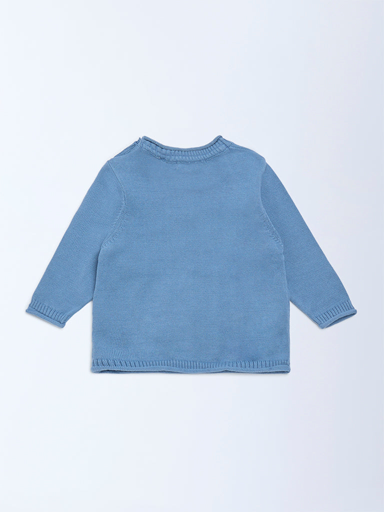 A joyful winter pick from HOP Baby, this blue sweater features playful Christmas-themed motifs, celebrating the season. It is styled with a crew neck, full sleeves and a buttoned shoulder allowing for easy, fuss-free dressing. Knitted from a cotton-rich fabric, it keeps little ones warm and comfortable through the season.