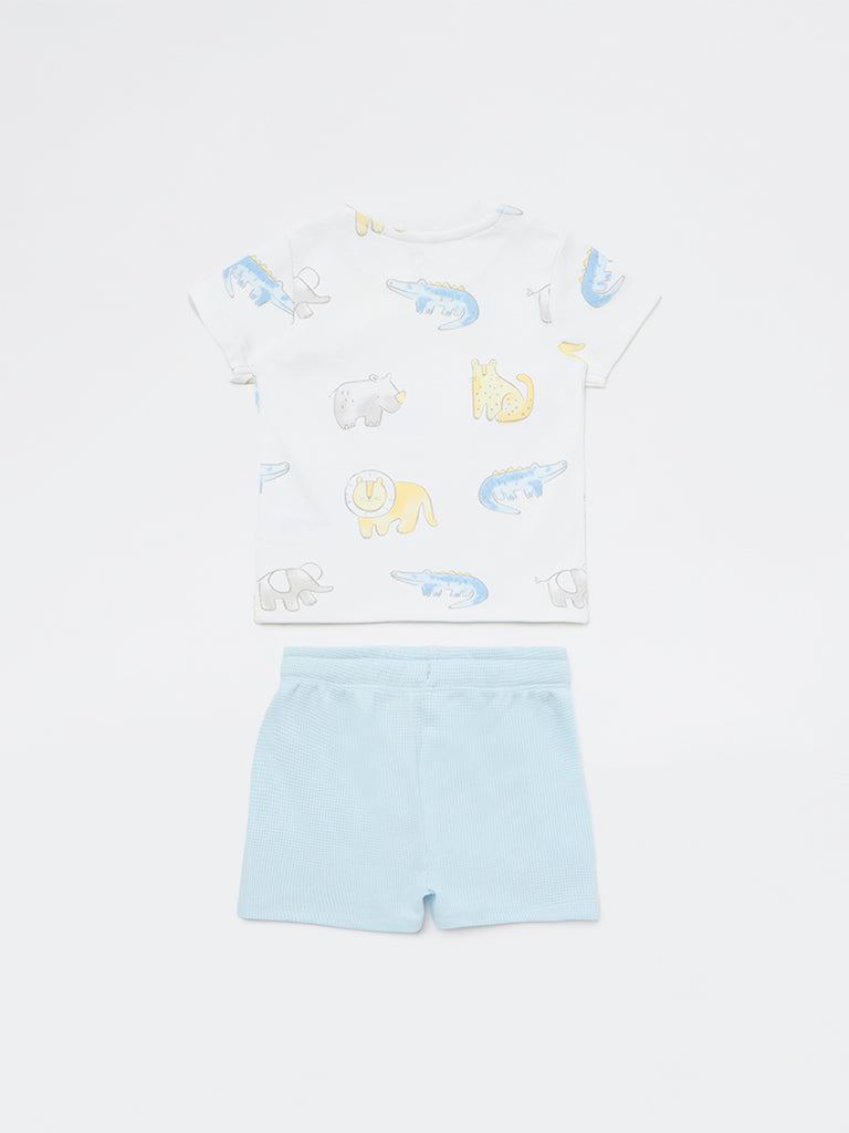HOP Baby Boys White Animal Printed Cotton T-Shirt and Shorts Set