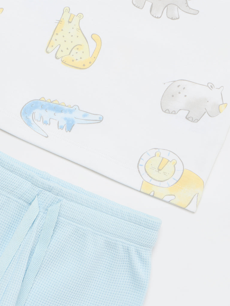 Fun and playful, this white set from HOP Baby consists of a t-shirt showcasing animal prints that adds a cheerful touch. It is styled with a crew neck and short sleeves. The waffle-textured blue shorts are designed with an elasticated waistband and adjustable drawstrings for a secure fit. This set is woven from breathable cotton fabric that allows an all-day soft feel, making this a comfortable choice for playtime and outings.