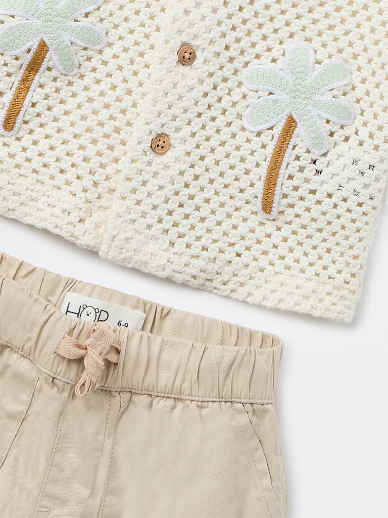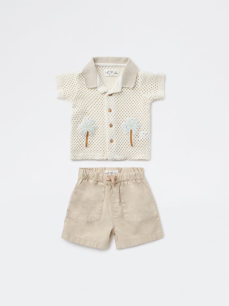 HOP Baby presents this white charming set for infant boys. The crochet-knit design features tropical motifs and is designed with a camp collar, a button-up front and short sleeves.Light beige shorts feature an elasticated waistline with adjustable drawstrings for an easy fit. Crafted from soft cotton fabric, the set keeps baby skin comfortable while offering a light, breathable feel suited for warm days and easy movement.