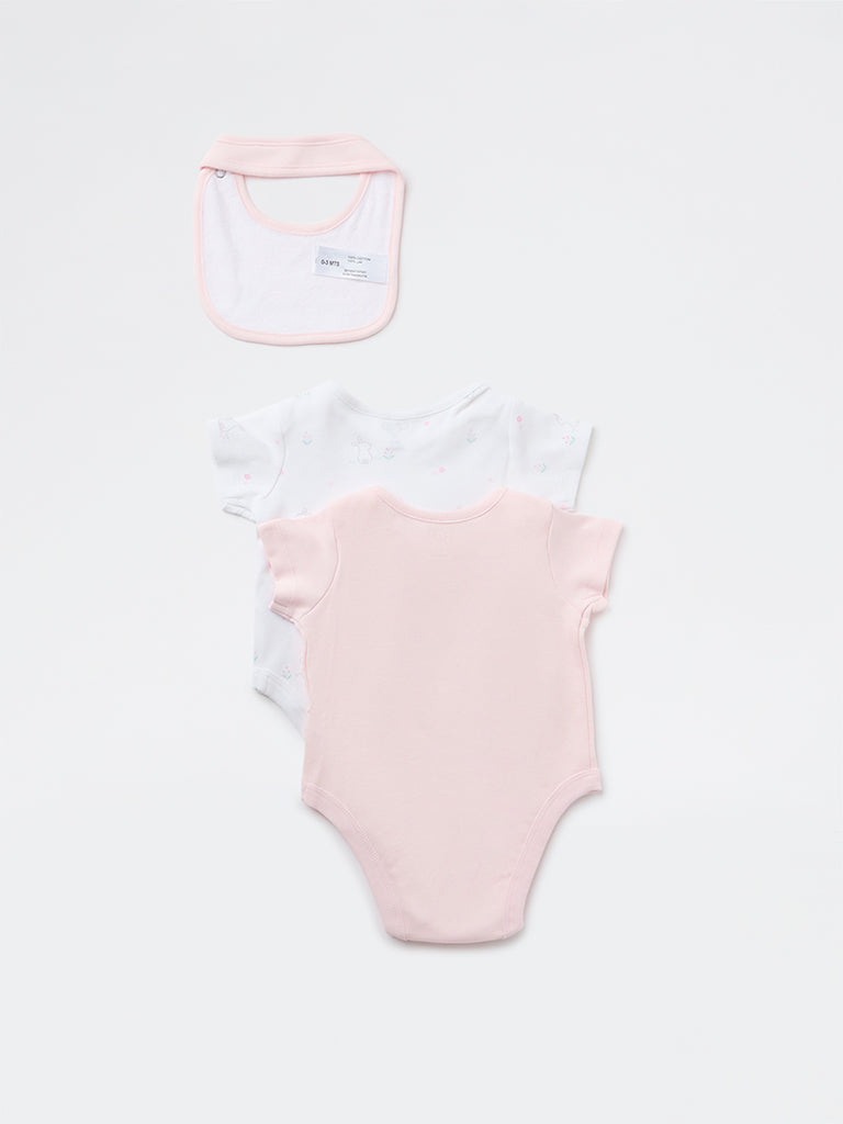 HOP Baby presents this adorable set featuring two cotton rompers and a matching bib, crafted from soft, breathable fabric for everyday comfort. The rompers come in gentle pastel pink and white tones, with one styled with a playful graphic print and the other detailed with subtle all-over accents. Designed with round necks, short sleeves, and snap-button closures at the crotch, they ensure easy dressing, while the coordinating bib completes this sweet and practical set.