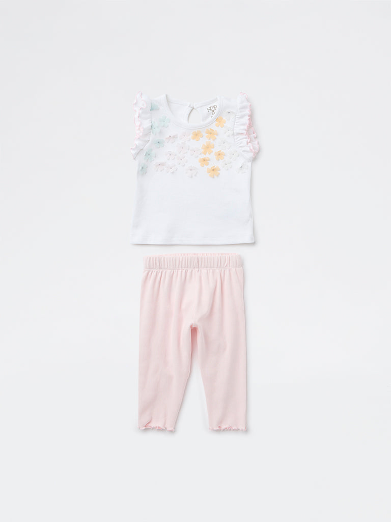 HOP Baby Girls White Floral Applique Detailed Cotton Top and Pants Set