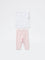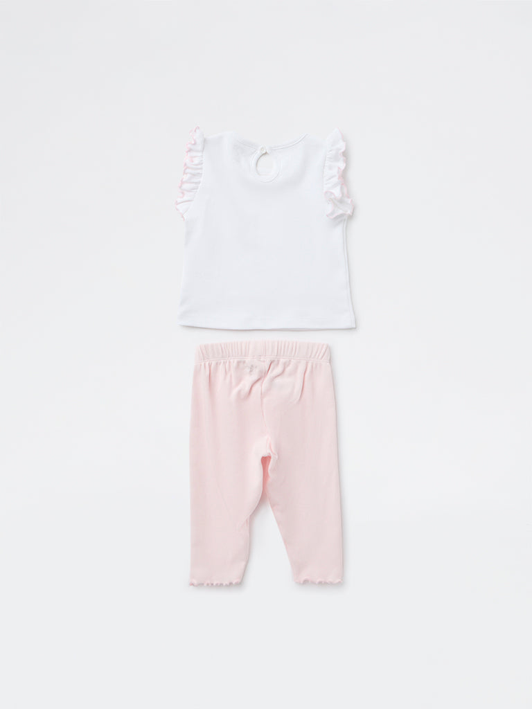 HOP Baby presents this charming set featuring a crisp white cotton top paired with soft pastel pink pants for a sweet, coordinated look. The round-neck, sleeveless top showcases delicate multicoloured floral appliqué and playful ruffled trims at the shoulders, while the pants feature an elasticated waistband and ruffled hems. Finished with a keyhole button closure at the back for easy dressing, this breathable duo keeps your little one comfortable and stylish for any outing.