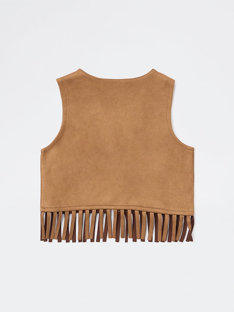 HOP Kids presents this sleeveless tan-coloured top crafted from rich suede fabric for a luxe finish. Designed with a deep V-neckline and a single loop-button fastening, it features subtle embroidery along the neckline and tassel detailing at the hemline.
