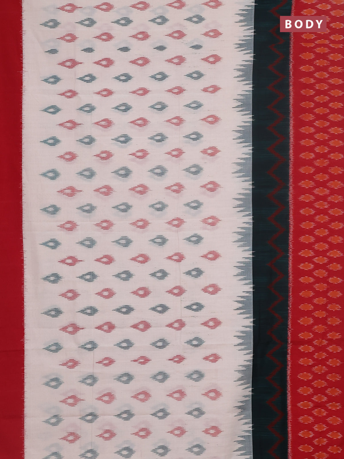Ikat cotton saree off white and peacock green red with allover ikat butta weaves and long ikat style border