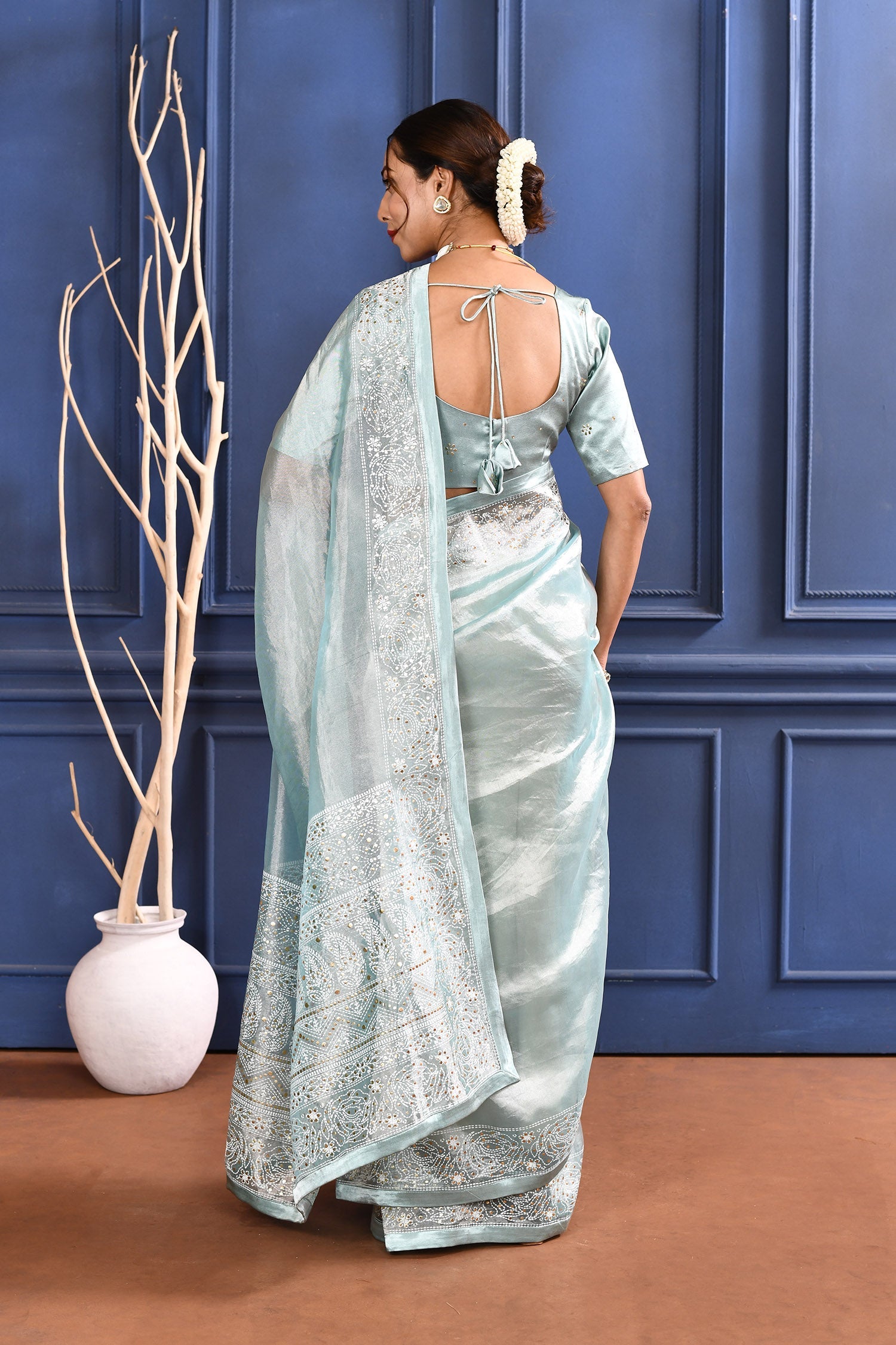 The jewel blue foil printed tissue saree with self border and blouse for a rich look along with foil printed floral design for subtle grace.