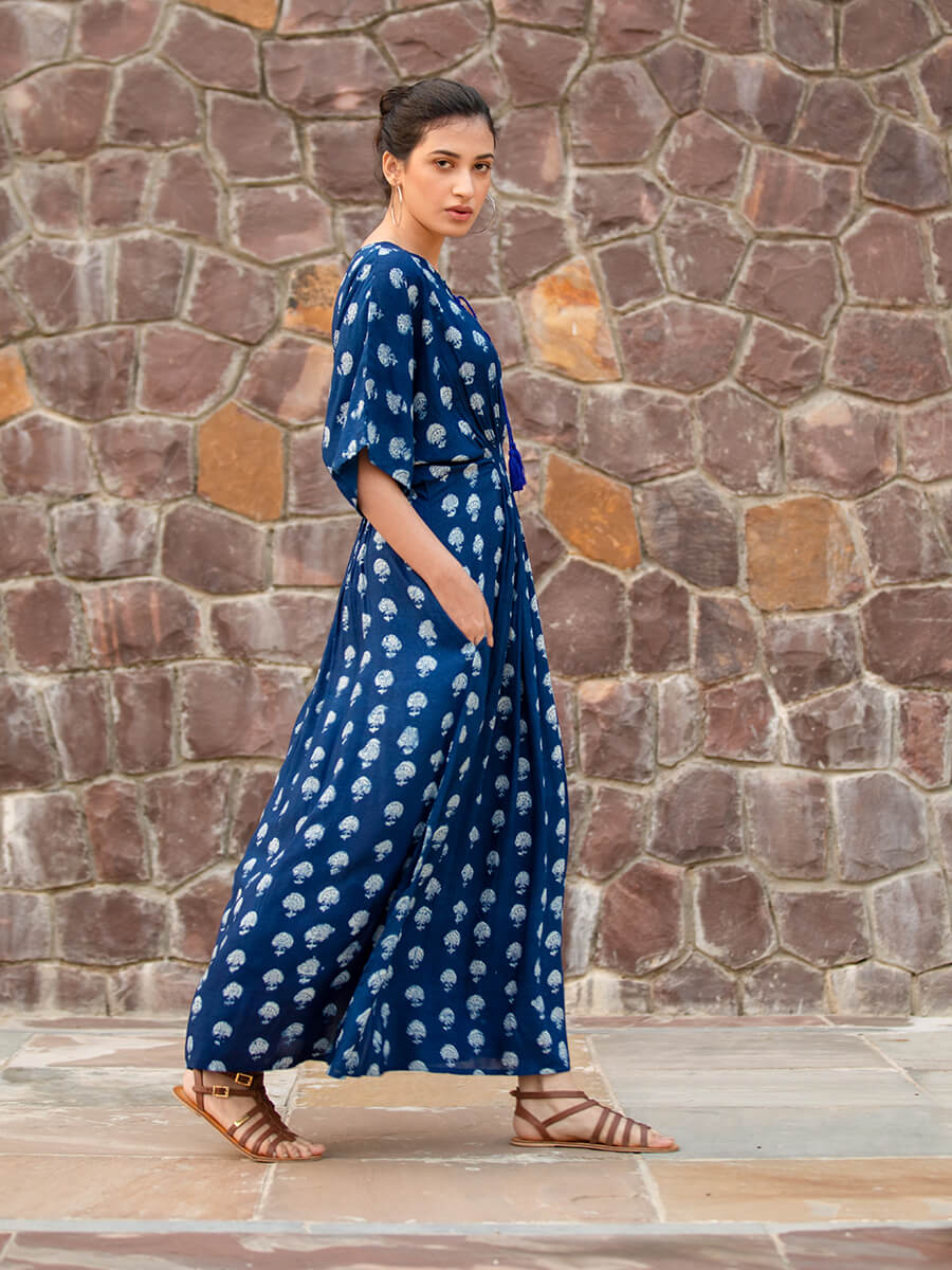 Jheel Indigo Printed Modal Kaftan Maxi Dress