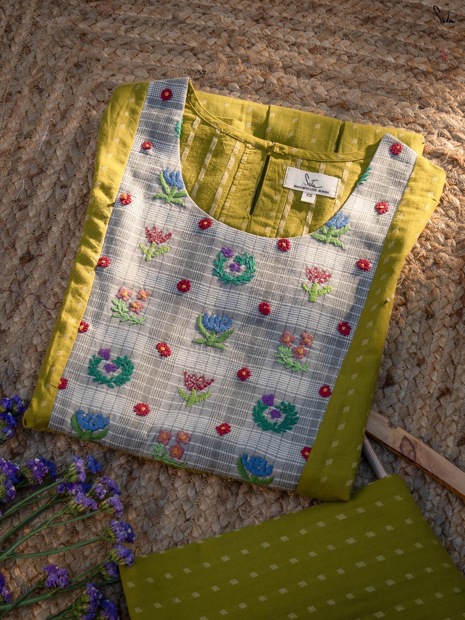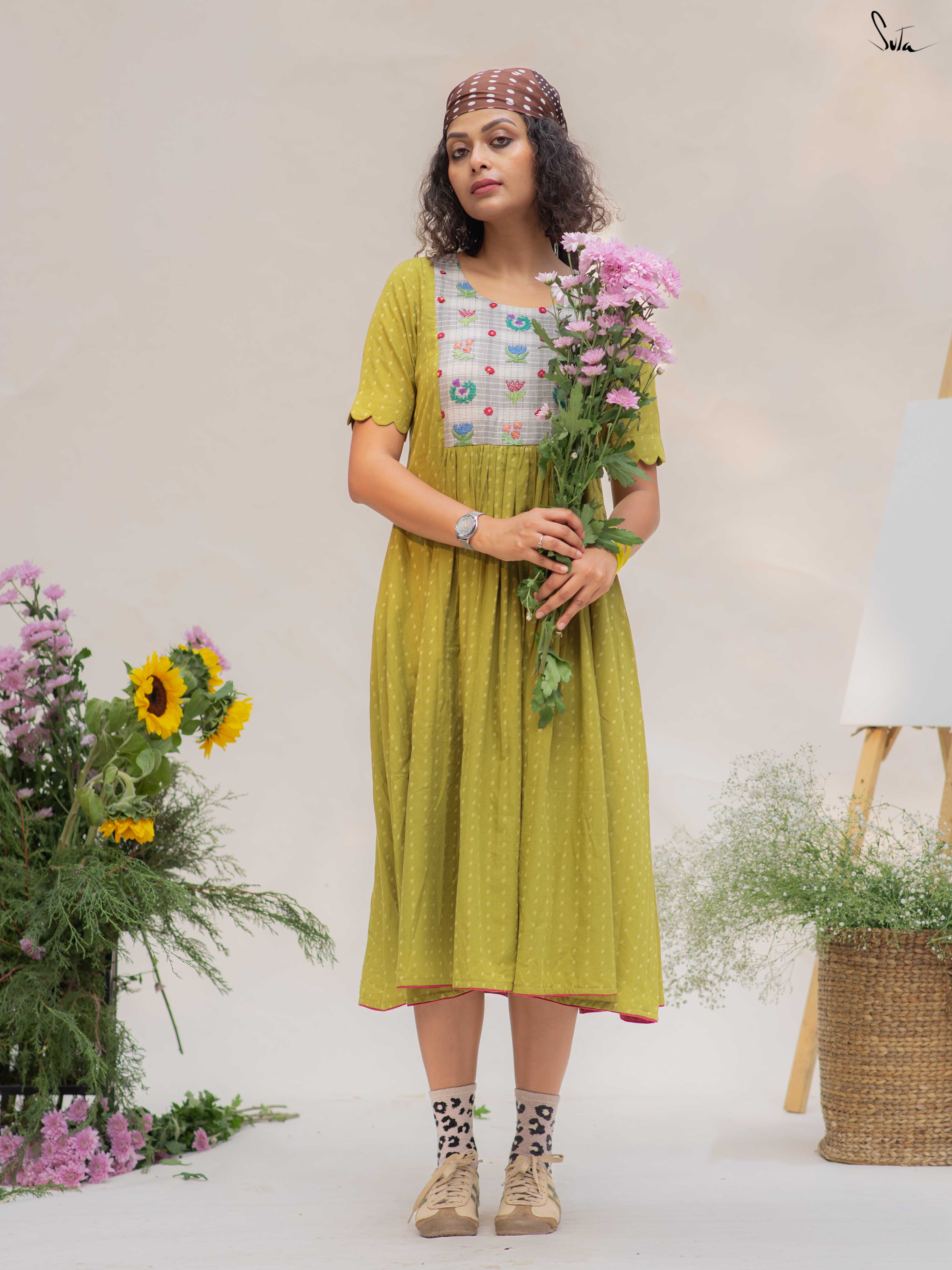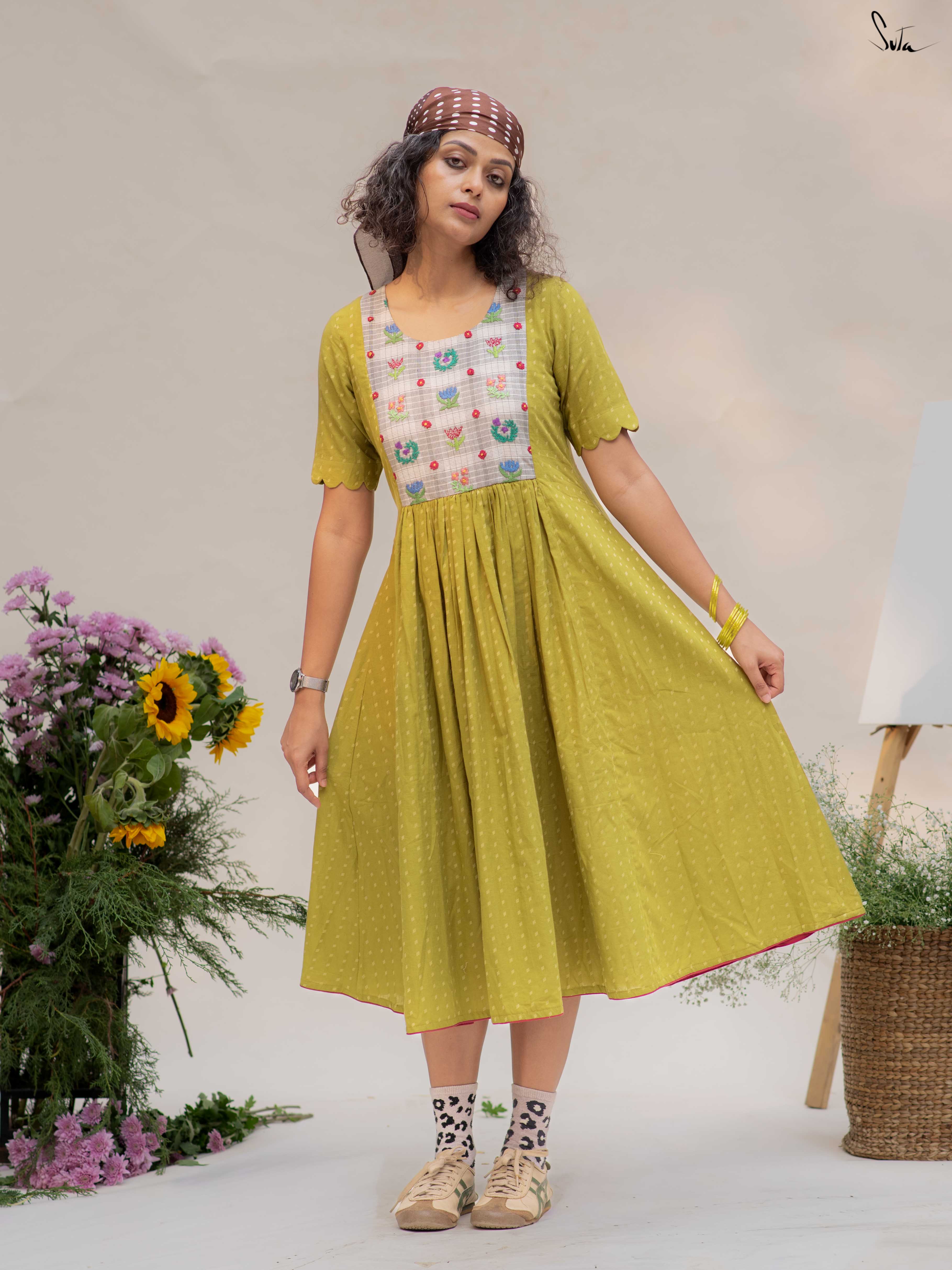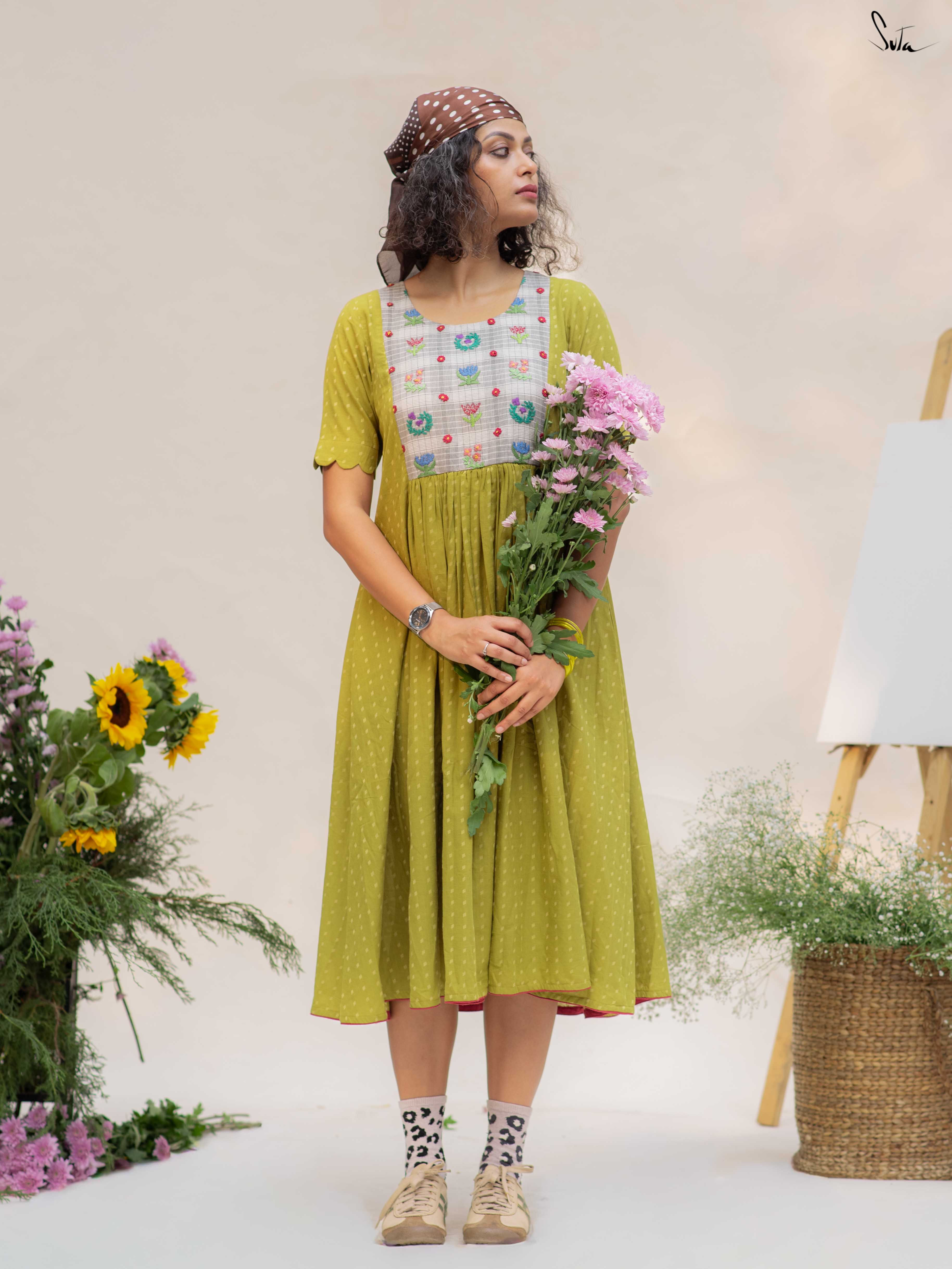 This green cotton dress features a contrast hand-embroidered floral yoke, stitched slowly and thoughtfully. The round neck keeps it timeless, while the short sleeves with scalloped edges add a soft handcrafted touch. Finished with pockets on both sides, it’s made for long, comfortable days.