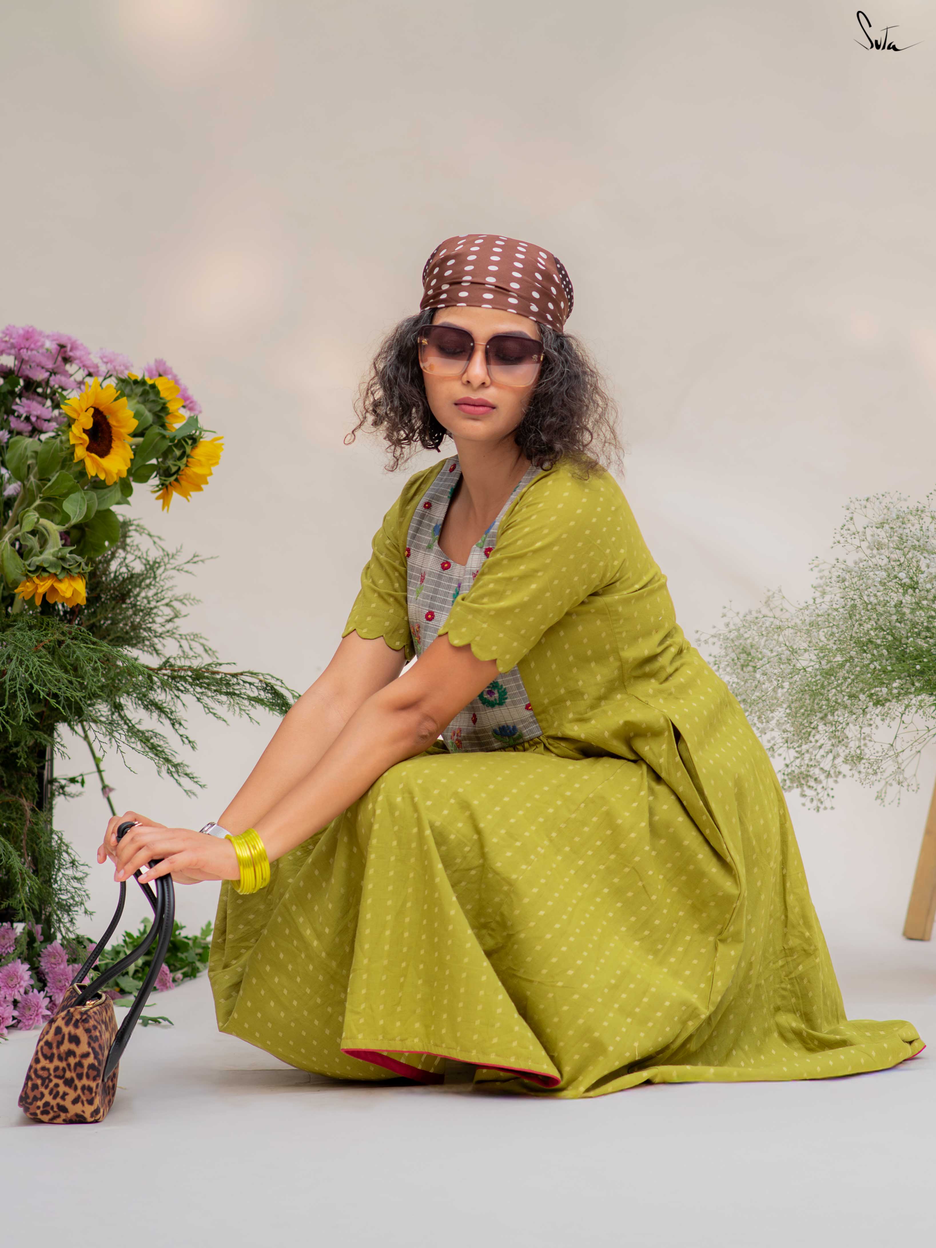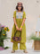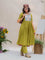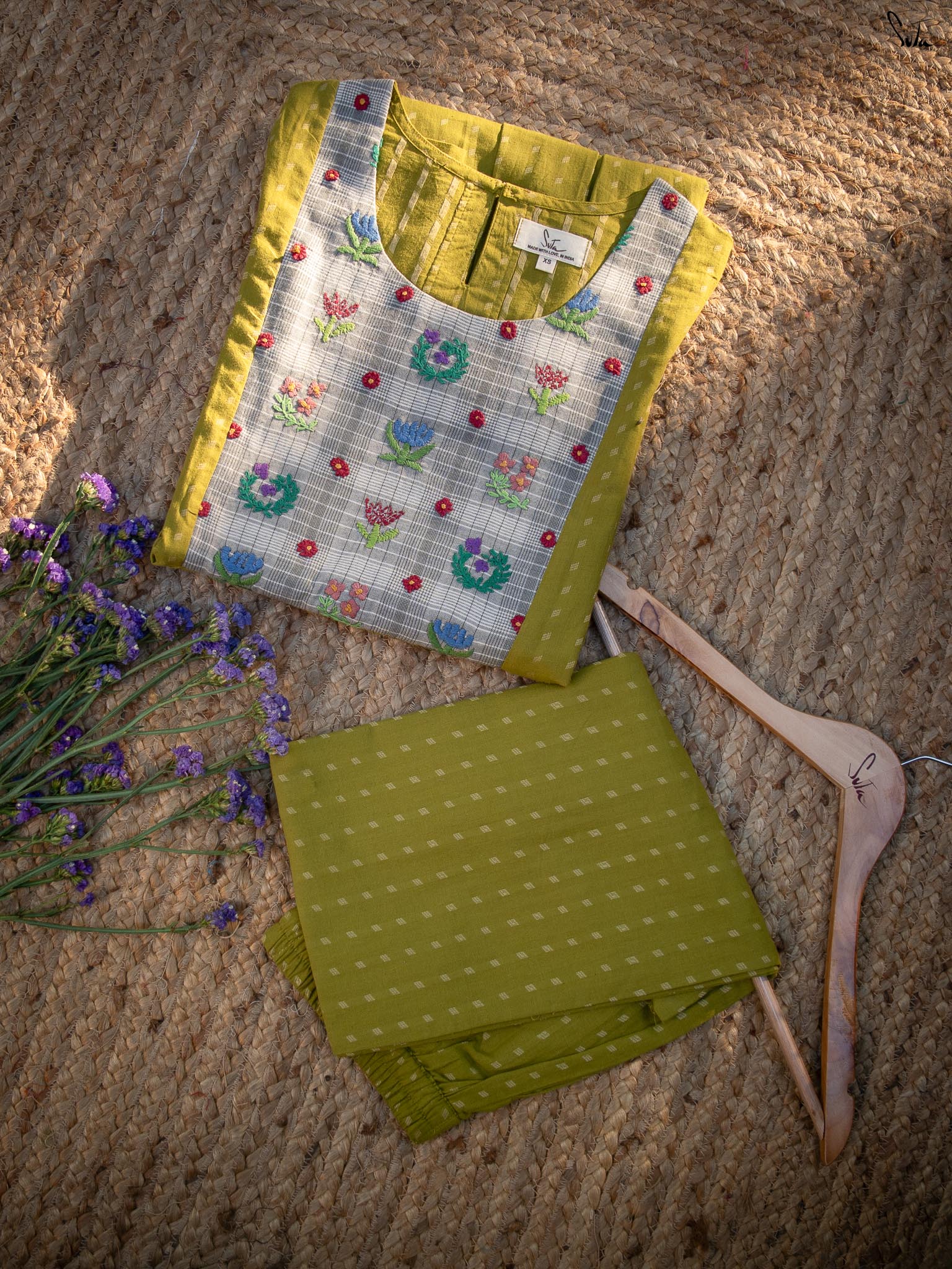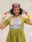 The green cotton kurta is finished with a contrast hand-embroidered floral yoke  -  detailed, thoughtful, and quietly beautiful. It has a classic round neck, short sleeves with scalloped edges, and pockets on both sides for everyday ease. The matching green cotton pants complete the set with a scalloped hem, elasticated waist, and side pockets.