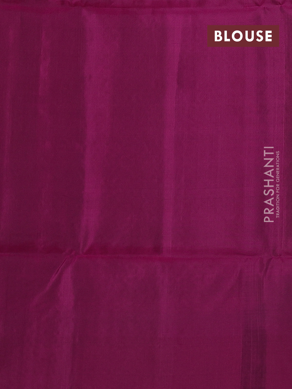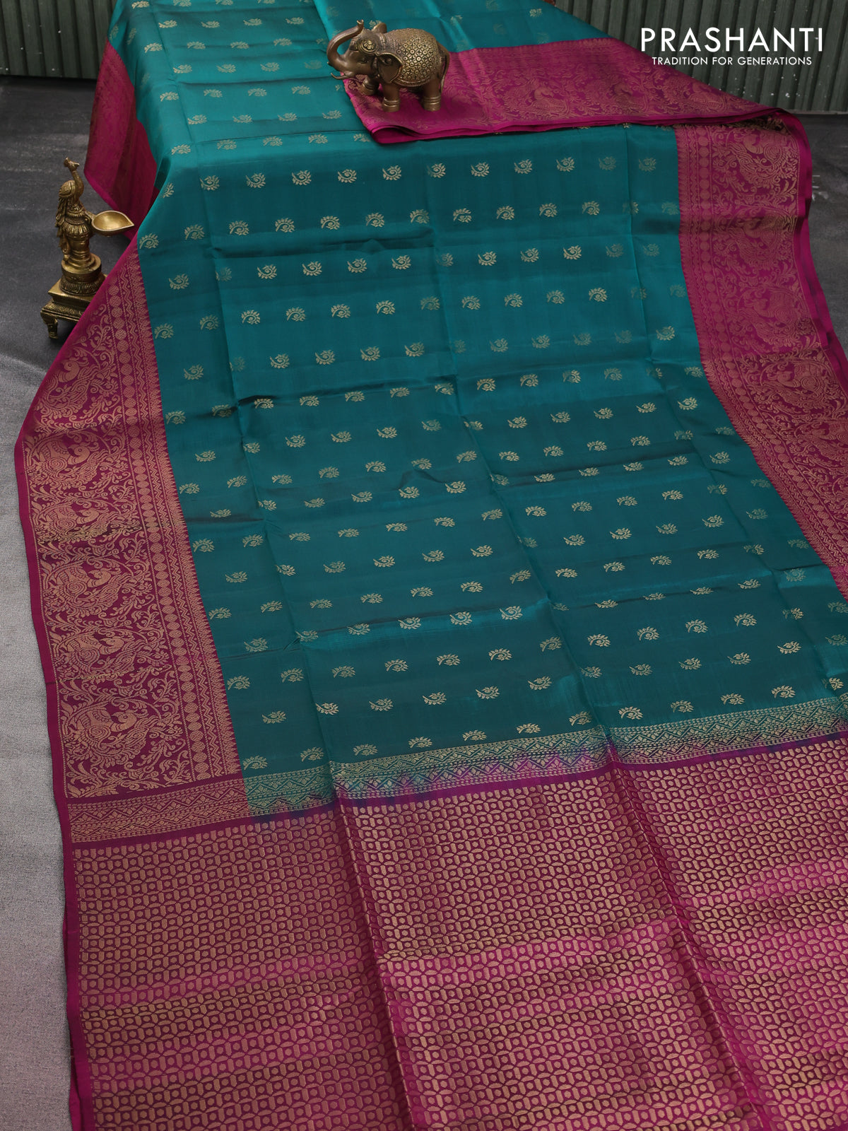 Kanchipuram soft silk saree peacock green and dark magenta pink with allover zari woven buttas and long zari woven border