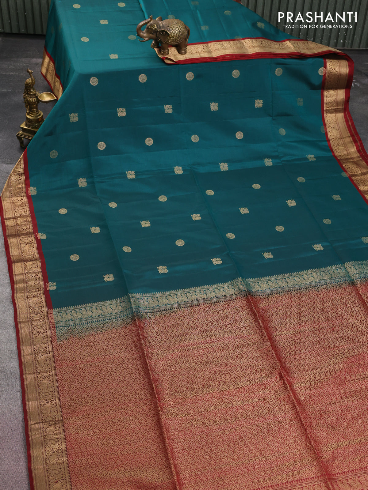 Kanchipuram soft silk saree peacock green and maroon with annam & rudhraksha zari woven buttas and annam zari woven border