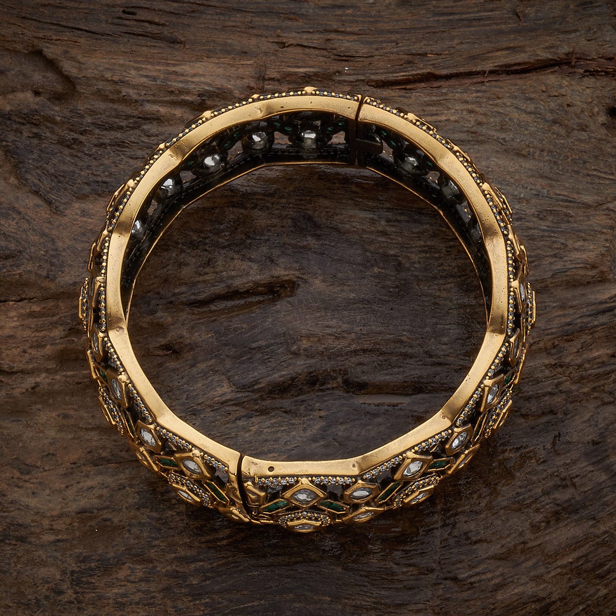 Kundan stones are splendid on their own, but when paired with other stones, you get an accessory that blinds everyone with its shine, like our latest Kundan bangle with green stones. The locking system of this bangle will keep you comfortable at all times for the best wearing experience with your favorite outfit.