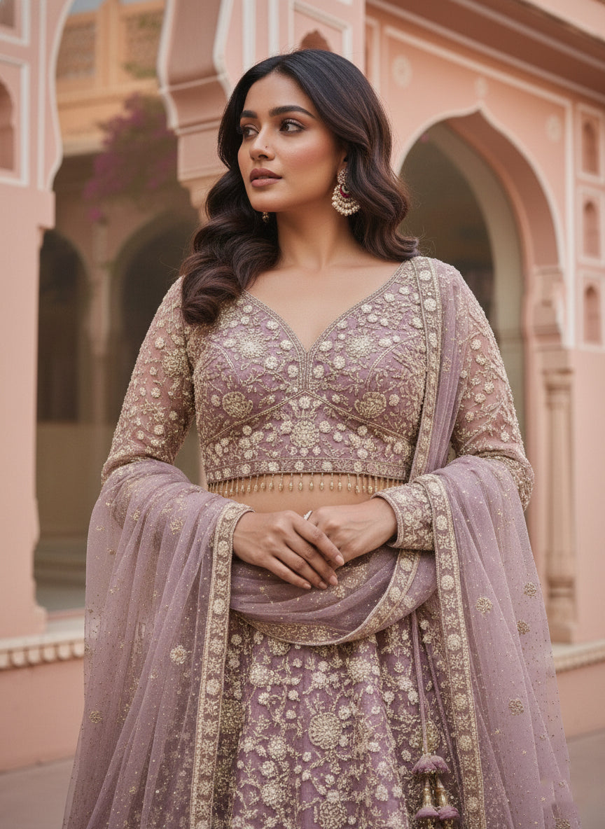 Elevate your ethnic wardrobe with this stunning lavender net ghagra set, featuring intricate heavy floral embroidery that captures timeless elegance. The delicate net fabric drapes beautifully, creating a graceful silhouette perfect for weddings, festivals, and special celebrations. Each embroidered detail is meticulously crafted to showcase traditional artistry with a contemporary touch. The lavender hue complements all skin tones, while the voluminous ghagra skirt ensures comfort and movement. Ideal for those who appreciate quality craftsmanship and want to make a memorable impression at any occasion.