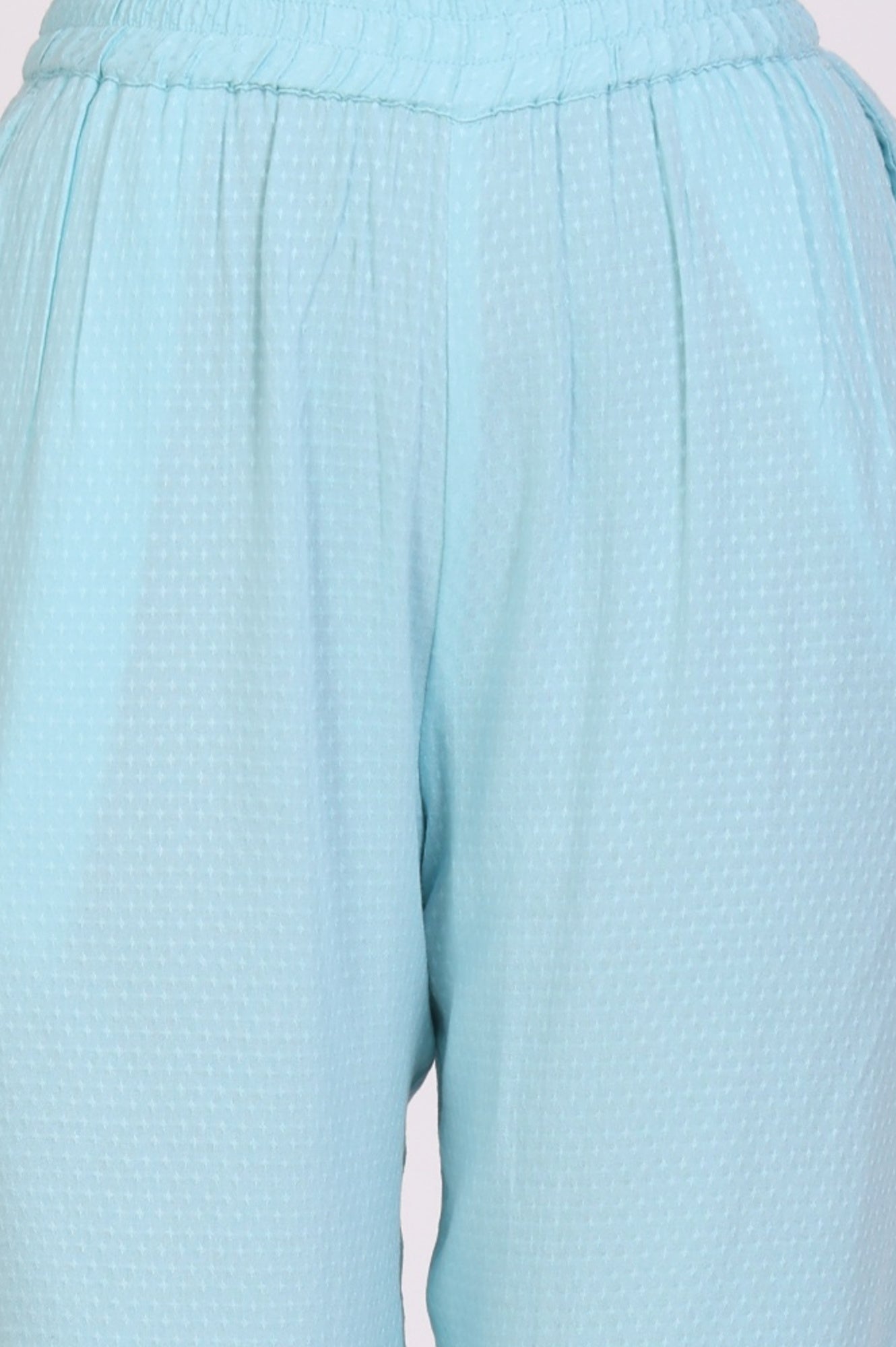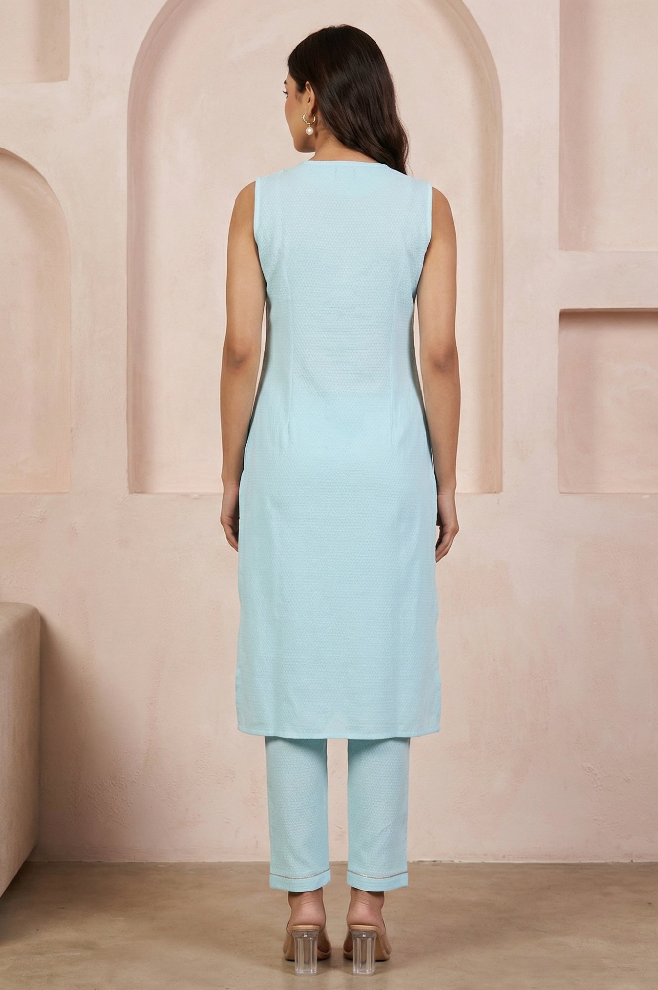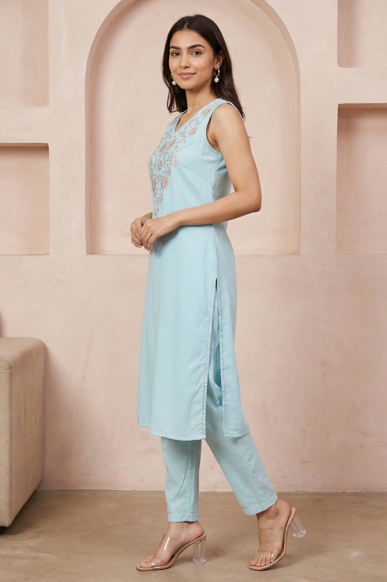 Update your daily wardrobe with this light blue viscose kurta set by Aurelia, designed for effortless comfort and style. The straight sleeveless kurta highlights delicate floral thread embroidery on the yoke, creating a refined focal point against the soft fabric. Paired with solid ankle-length trousers, this breathable ensemble is ideal for navigating summer office days or casual meet-ups. Style this ethnic set with pearl studs and simple flats for a polished, smart-casual look.