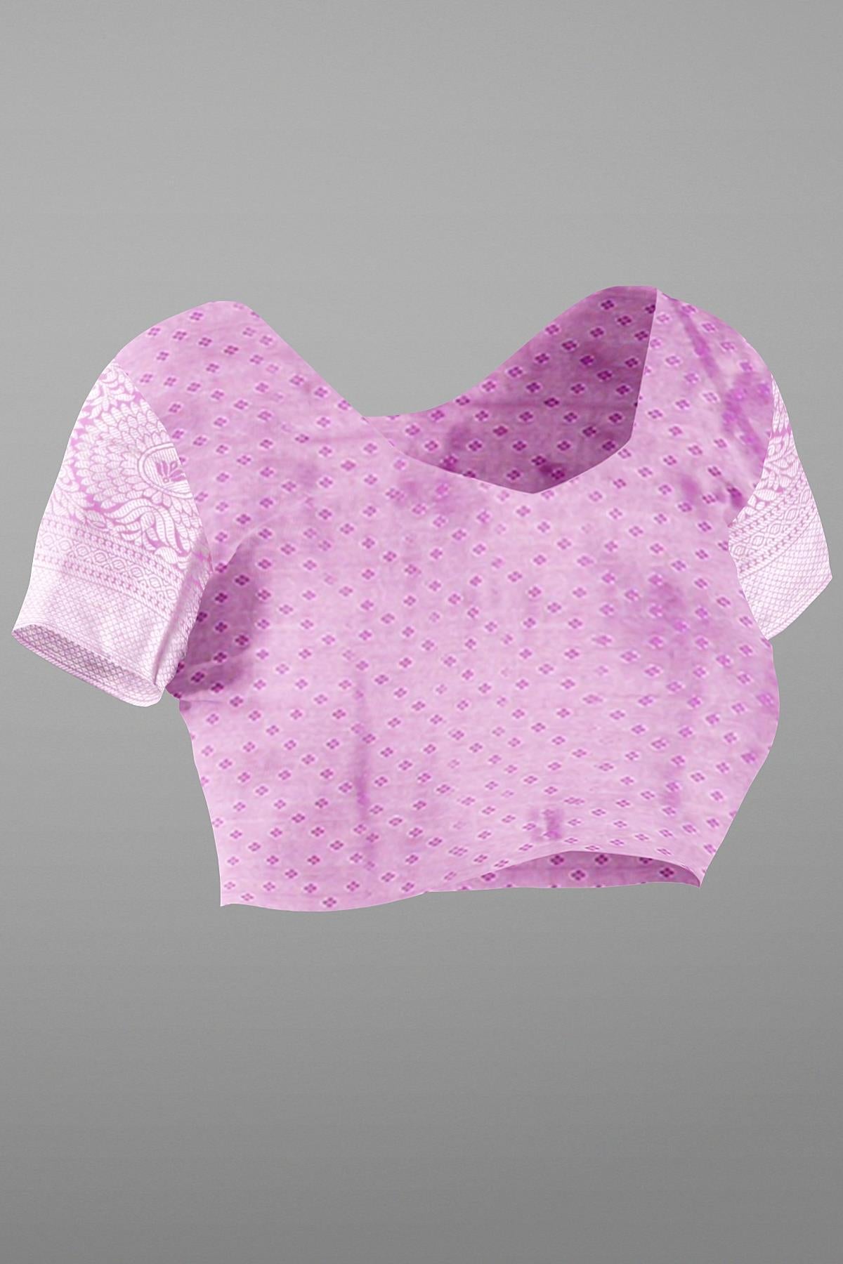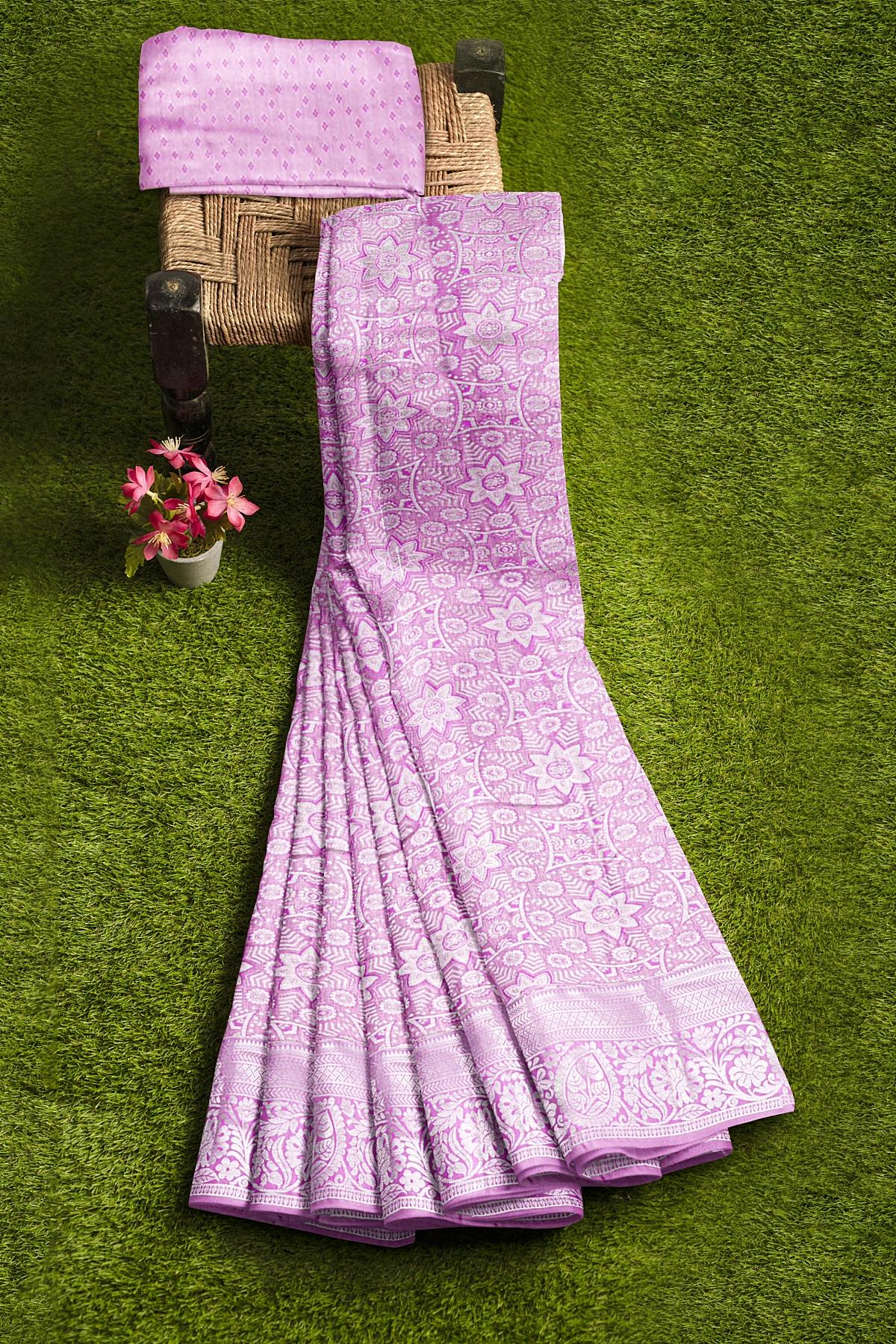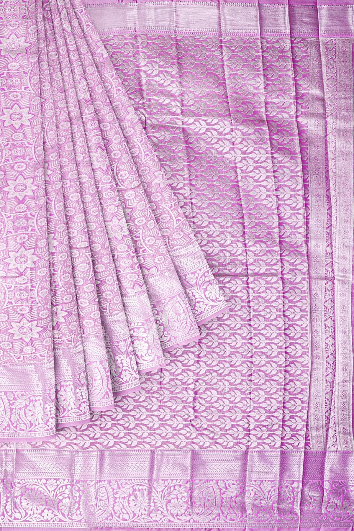 Latest LIGHT PINK FLORALS TISSUE SILK Saree with SELF ZARI border. This saree comes with ZARI WOVEN TISSUE SILK blouse.