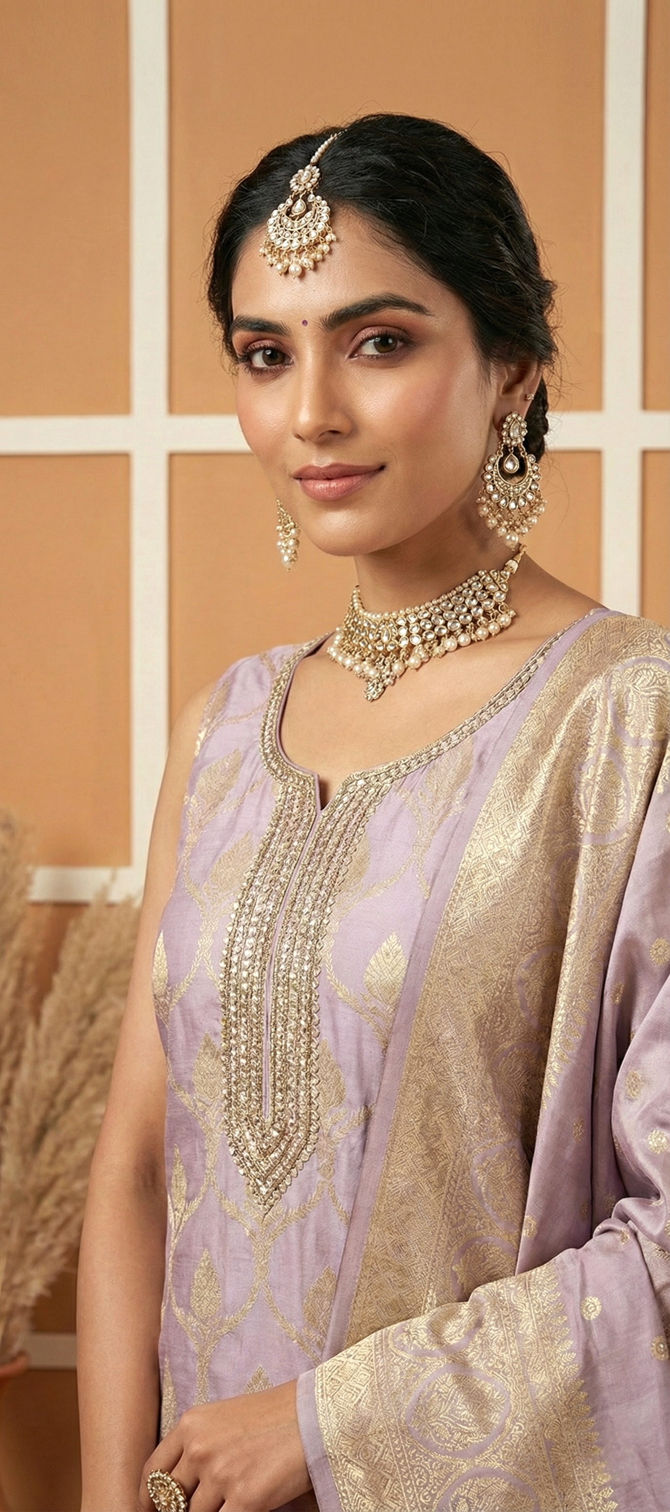 Elevate your ethnic wardrobe with this exquisite lilac tissue three-piece ensemble. Crafted from premium tissue fabric, this set features intricate printed detailing that showcases refined craftsmanship. The lightweight, breathable material ensures comfort throughout the day, making it ideal for festive occasions, celebrations, or formal gatherings. The coordinated three-piece design offers versatility and ease of styling. Perfect for those who appreciate traditional elegance with contemporary appeal, this set combines timeless aesthetics with modern sensibilities. A sophisticated choice for discerning customers seeking quality and grace.