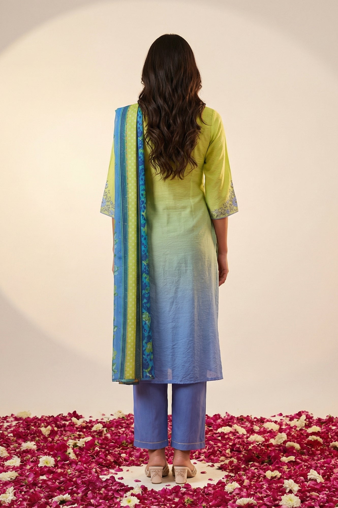 Lime Green Ombre Embroidered Straight Kurta with Palazzo and Dupatta Set