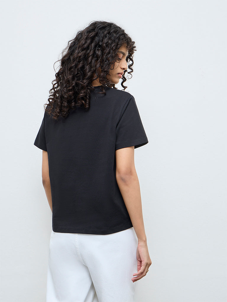 LOV Black Floral Embellished Cotton T-Shirt