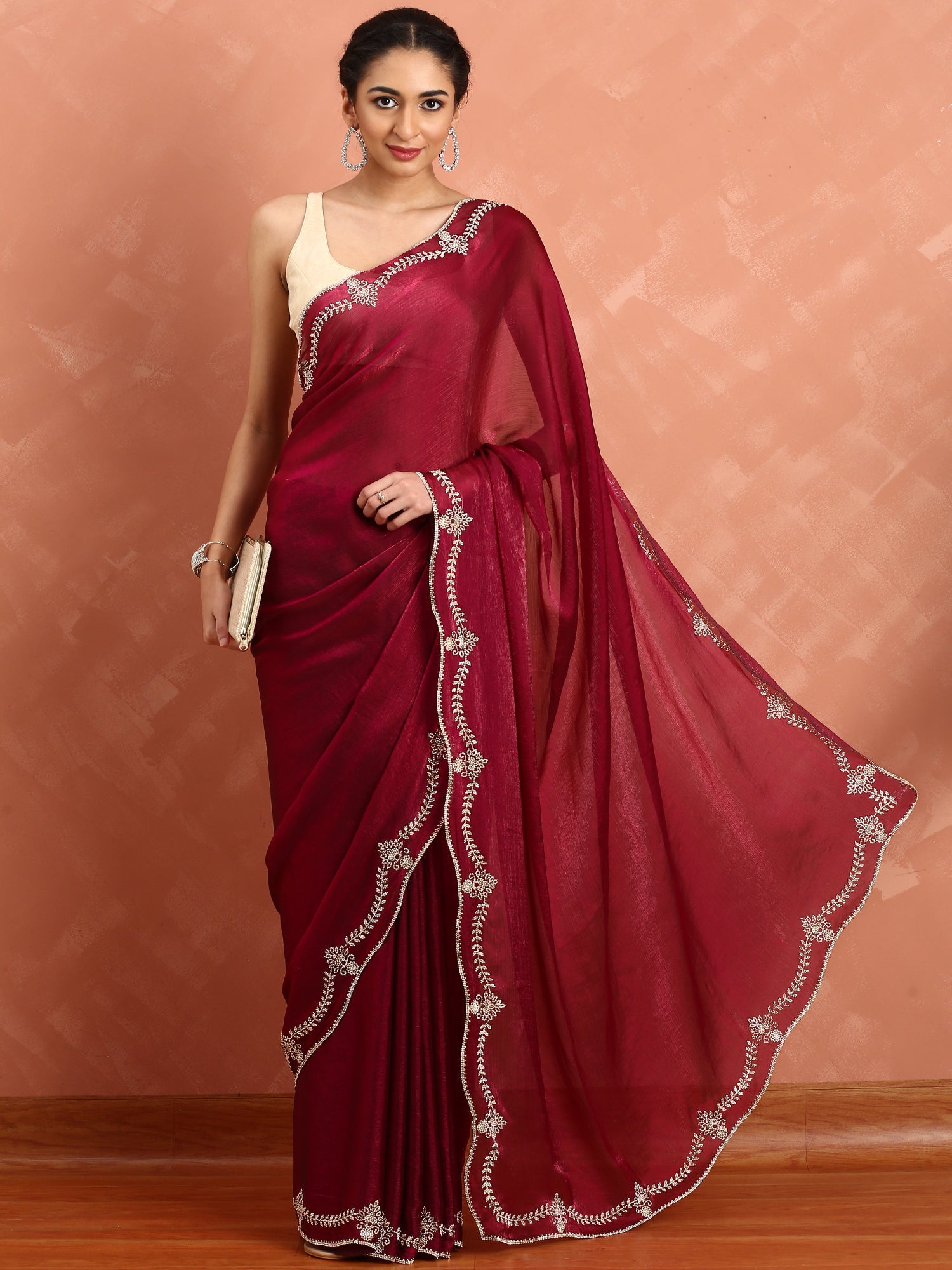 This mahroon jimmy tissue saree features exquisite cut Dana hand embroidery, blending traditional craftsmanship with elegant fabric. Its rich color and detailed work make it perfect for festive occasions, offering a graceful look that enhances your style with comfort and sophistication.