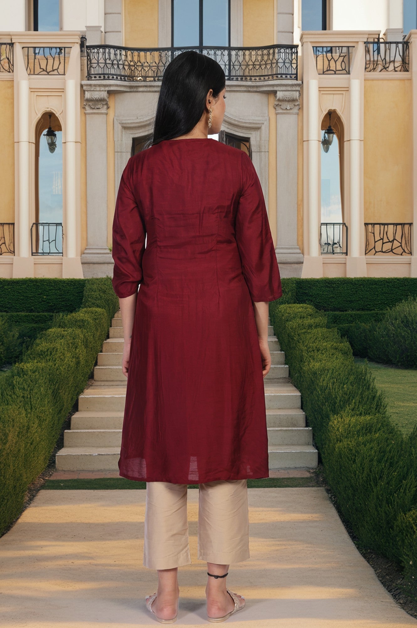 Here is the silhouette that flatters while it flows, a piece designed for the modern woman who cherishes timeless elegance. This beautiful kurta for women is presented in a sumptuous deep wine color, crafted from a material that catches the light with a subtle, rich sheen. The A-line shape glides effortlessly over the body, creating a silhouette that is both graceful and comfortable for long hours of celebration. All eyes will be drawn to the exquisite yoke, where intricate embroidery in contrasting tones frames the V-neckline, lending the piece an air of artisanal luxury. This ornamentation is the star, a perfect example of detailed craftsmanship. The kurta features elegant three-quarter sleeves and is fully opaque, ensuring complete comfort and confidence. Its straight hemline is punctuated with classic side slits, allowing for graceful movement. As a standalone piece, this festive tunic offers endless styling possibilities. It's the perfect choice for an evening soirée, a wedding reception, or any grand celebration on your calendar. Pair this party wear tunic with gilded accessories to complete your stunning look.